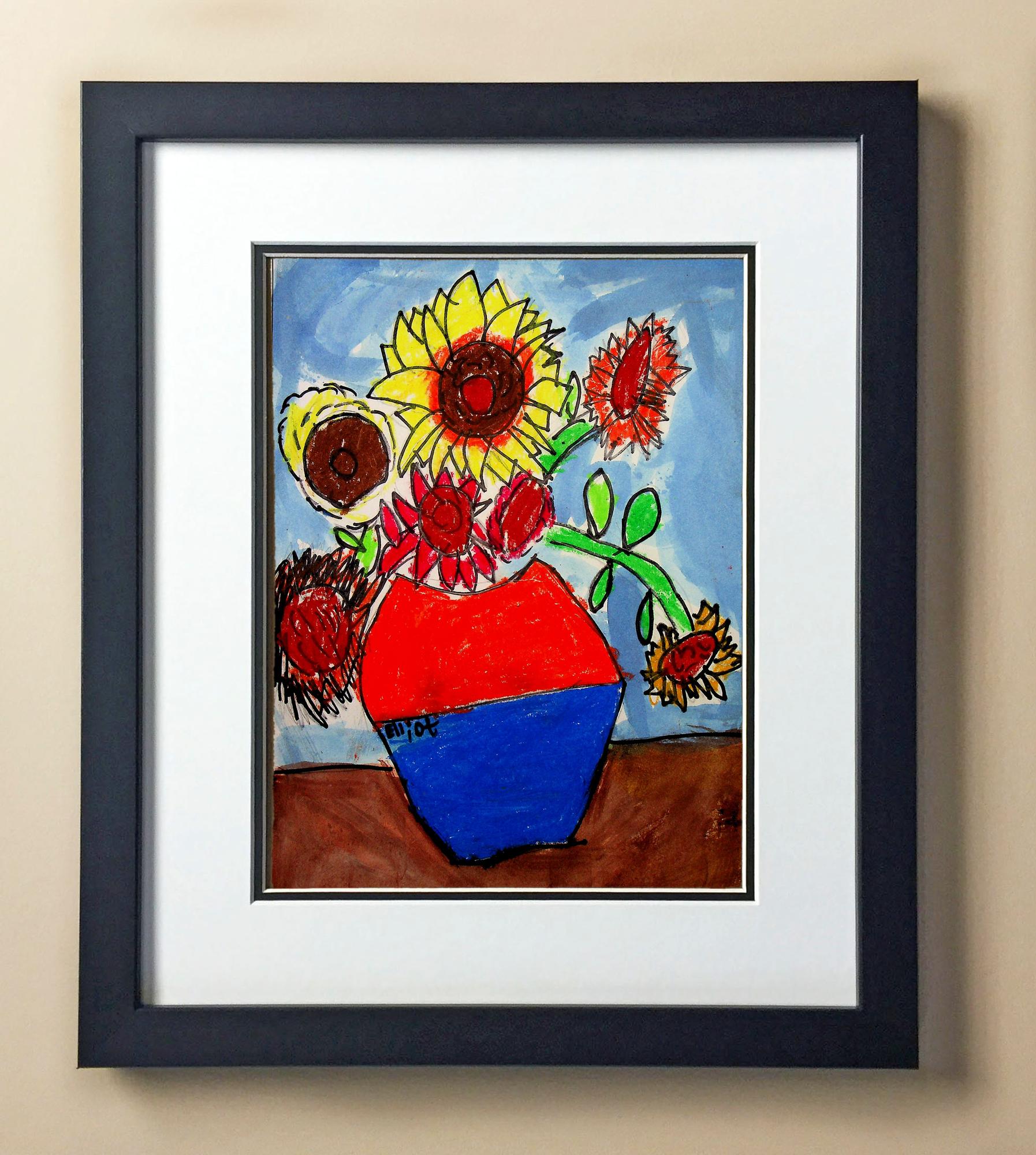 Included with the purchase is the Students Artwork, Frame, double matboard, shatter proof plexiglass, and a ready to hang backerboard with turnbuttons