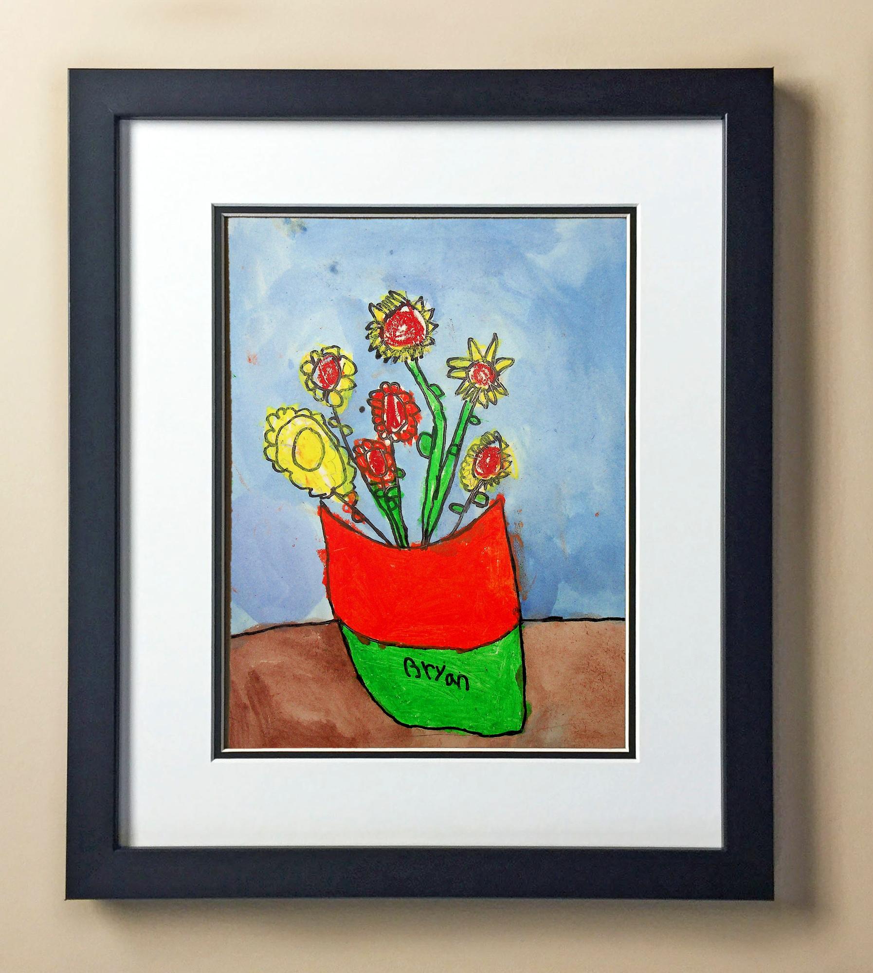 Included with the purchase is the Students Artwork, Frame, double matboard, shatter proof plexiglass, and a ready to hang backerboard with turnbuttons