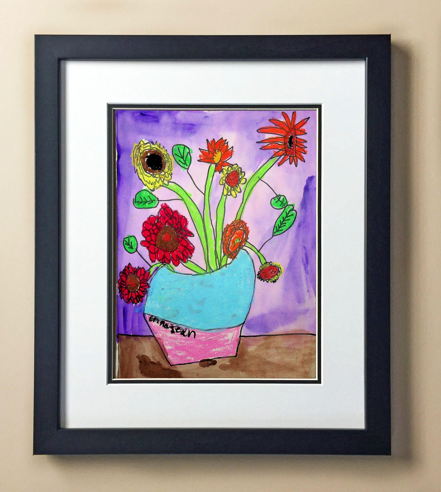 Included with the purchase is the Students Artwork, Frame, double matboard, shatter proof plexiglass, and a ready to hang backerboard with turnbuttons