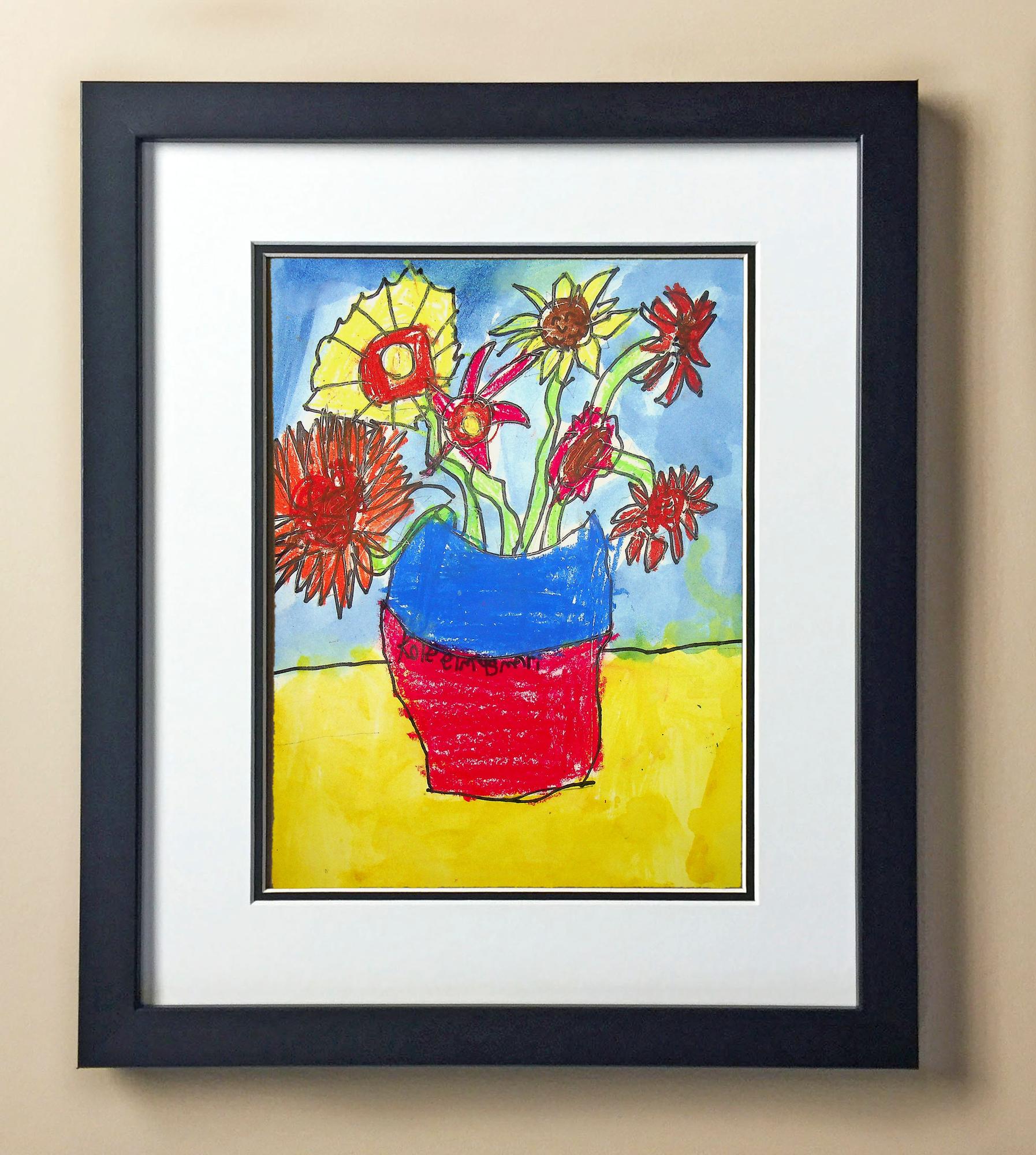 Included with the purchase is the Students Artwork, Frame, double matboard, shatter proof plexiglass, and a ready to hang backerboard with turnbuttons