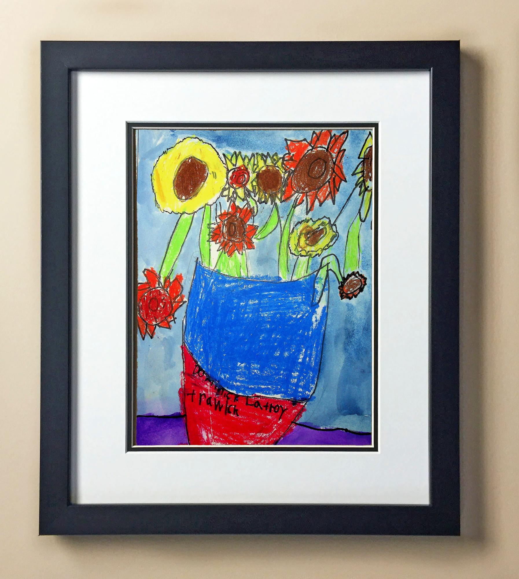 Included with the purchase is the Students Artwork, Frame, double matboard, shatter proof plexiglass, and a ready to hang backerboard with turnbuttons