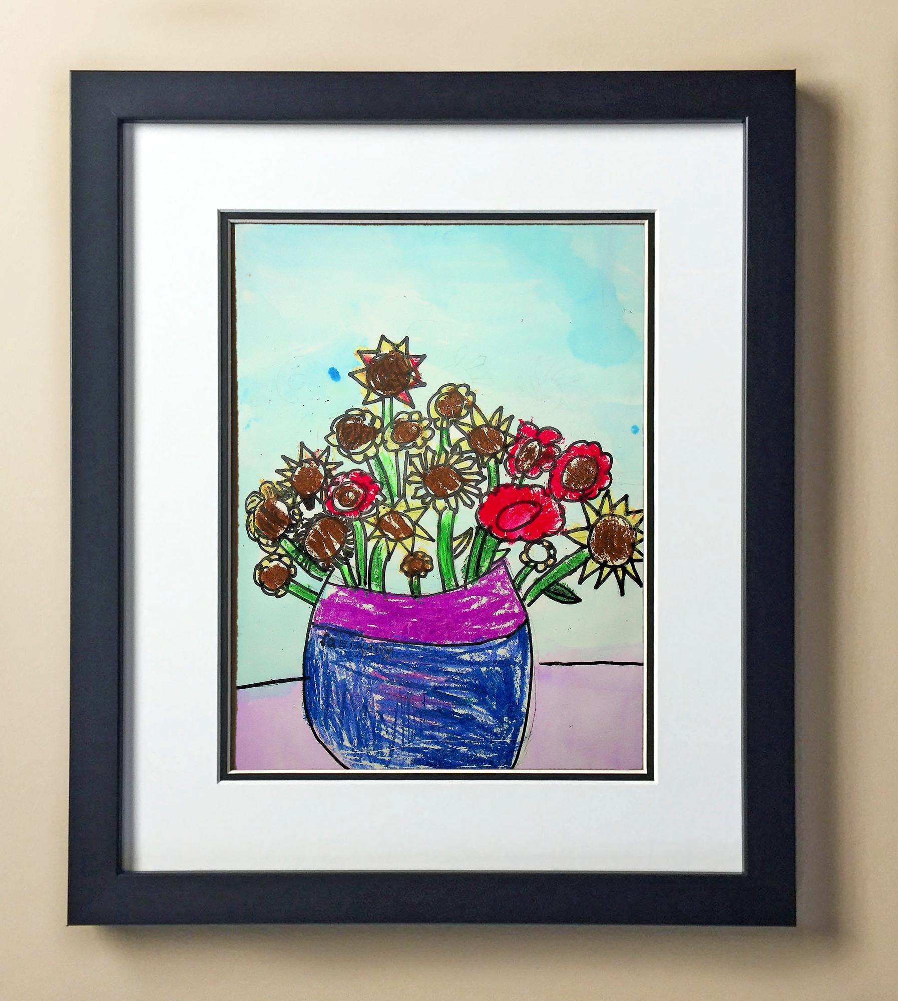 Included with the purchase is the Students Artwork, Frame, double matboard, shatter proof plexiglass, and a ready to hang backerboard with turnbuttons