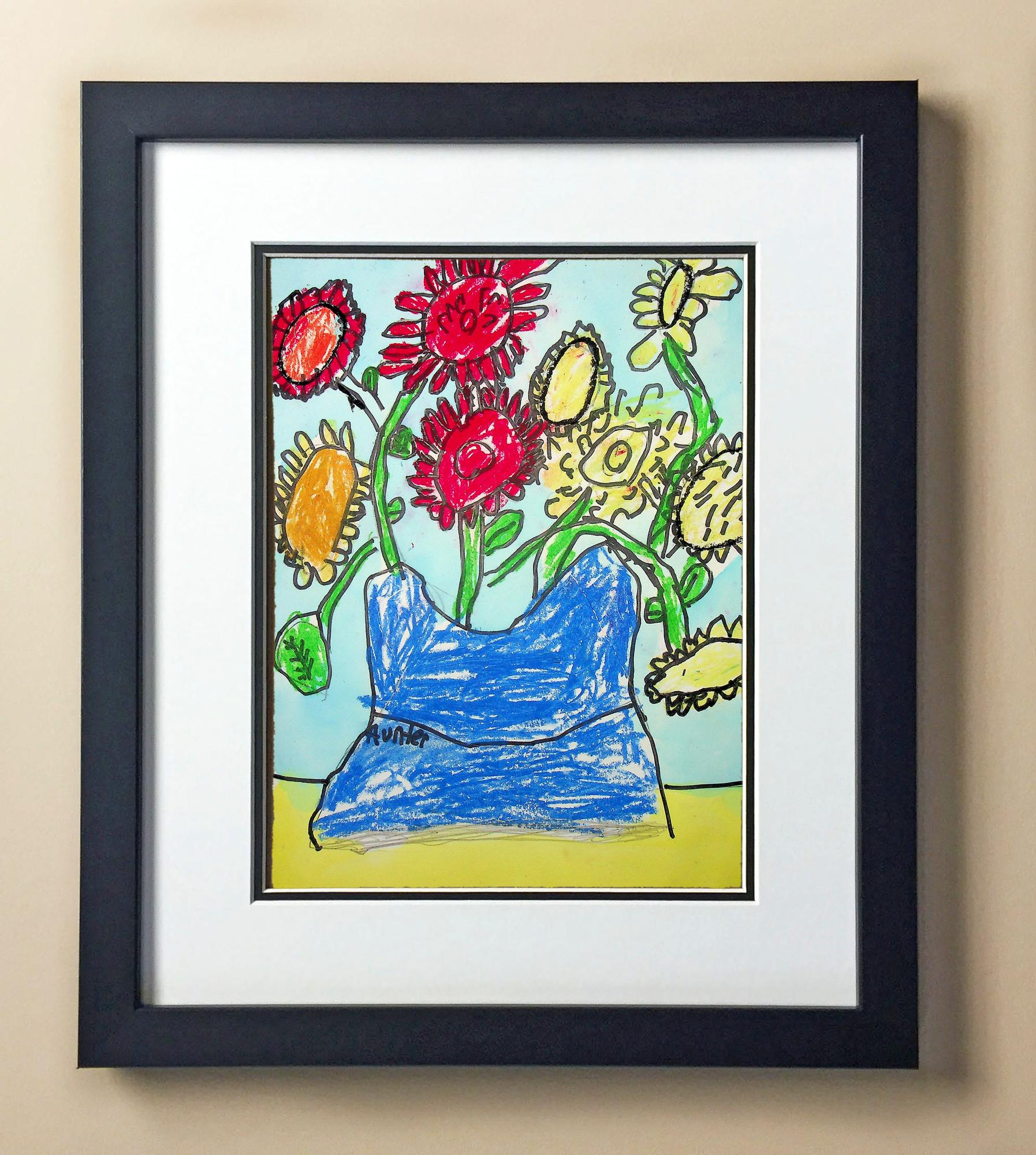 Included with the purchase is the Students Artwork, Frame, double matboard, shatter proof plexiglass, and a ready to hang backerboard with turnbuttons