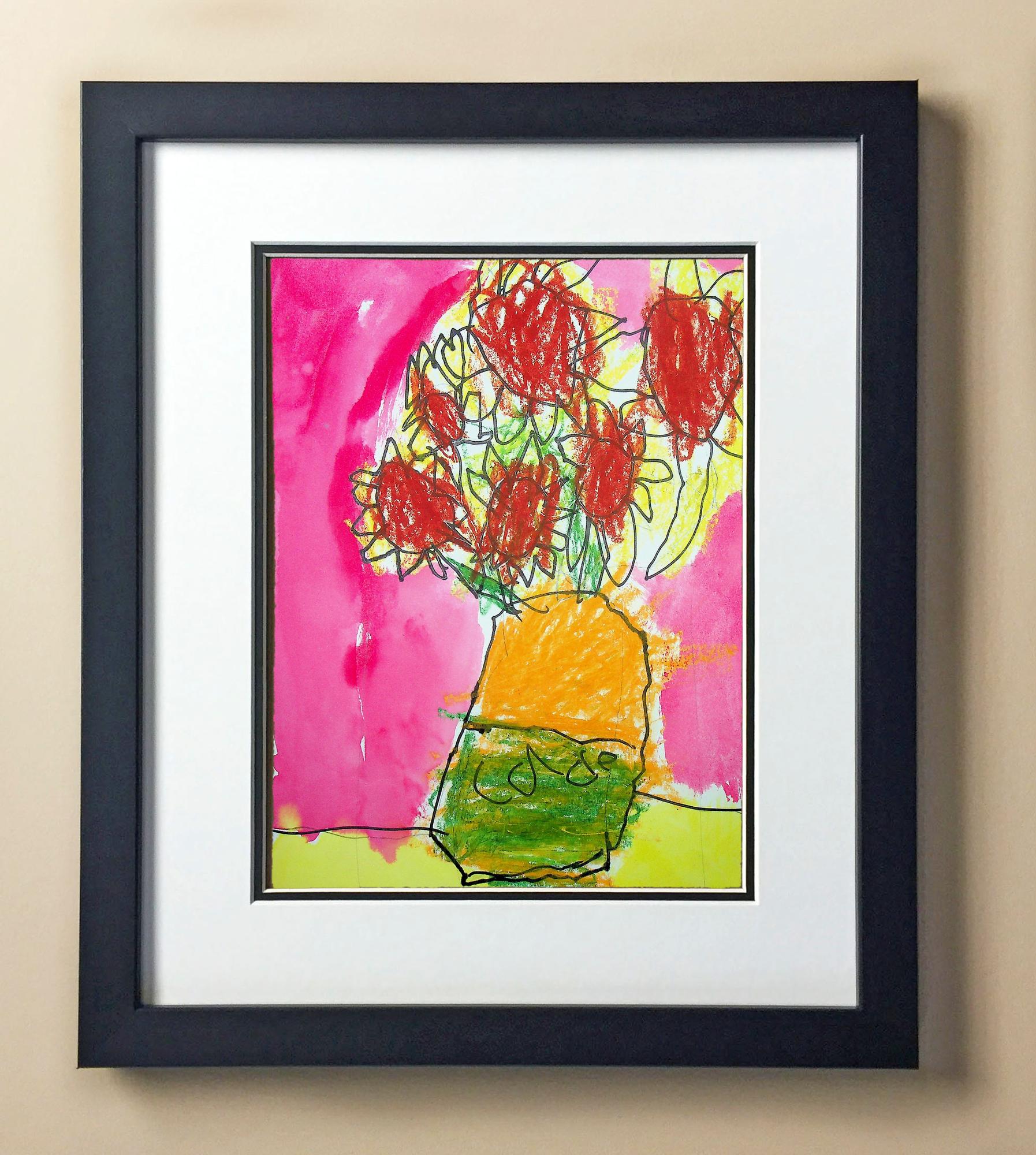 Included with the purchase is the Students Artwork, Frame, double matboard, shatter proof plexiglass, and a ready to hang backerboard with turnbuttons