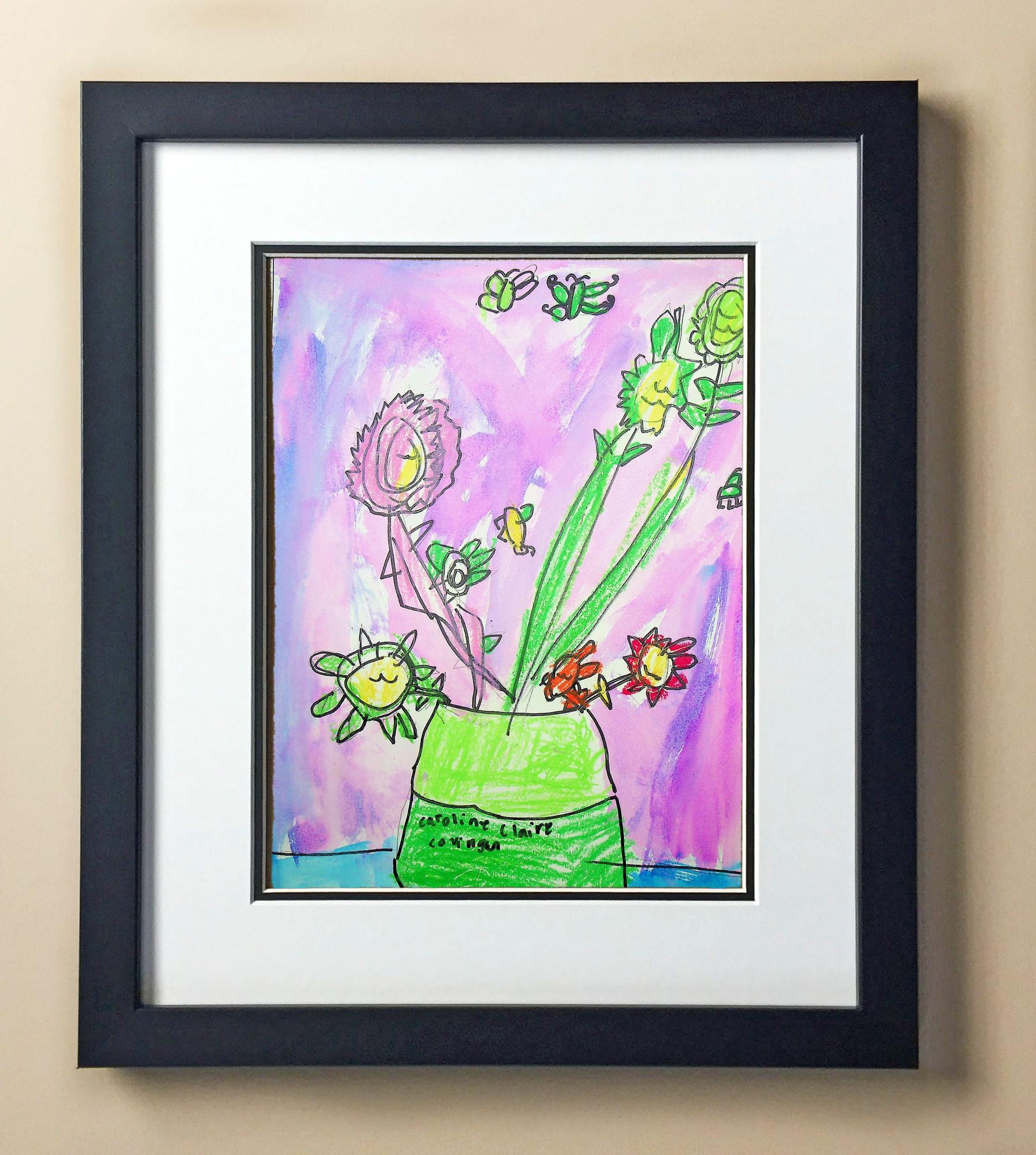 Included with the purchase is the Students Artwork, Frame, double matboard, shatter proof plexiglass, and a ready to hang backerboard with turnbuttons