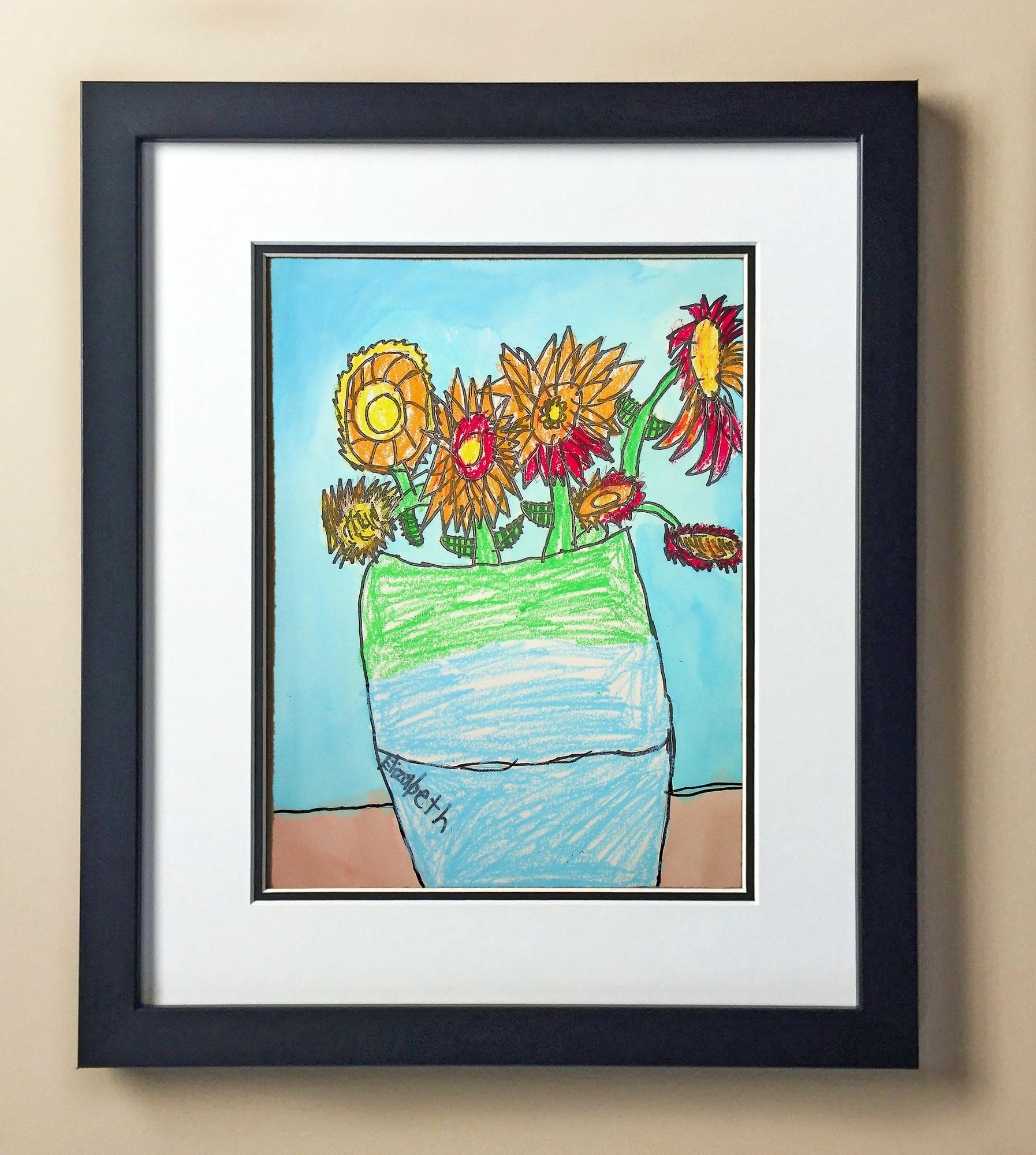 Included with the purchase is the Students Artwork, Frame, double matboard, shatter proof plexiglass, and a ready to hang backerboard with turnbuttons