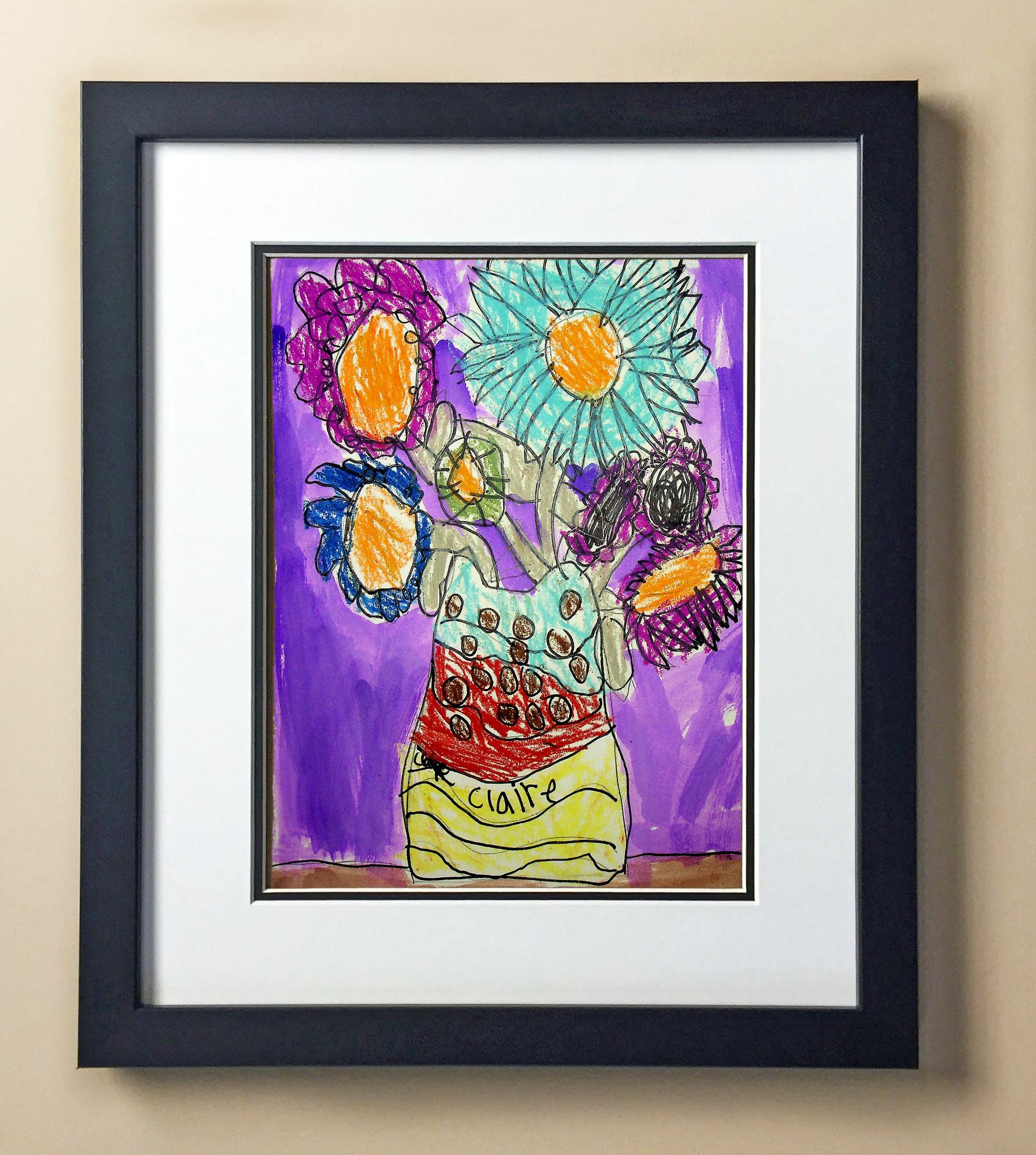 Included with the purchase is the Students Artwork, Frame, double matboard, shatter proof plexiglass, and a ready to hang backerboard with turnbuttons