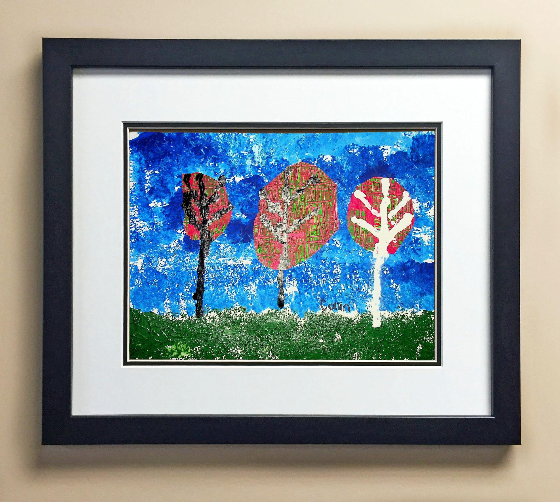 Included with the purchase is the Students Artwork, Frame, double matboard, shatter proof plexiglass, and a ready to hang backerboard with turnbuttons