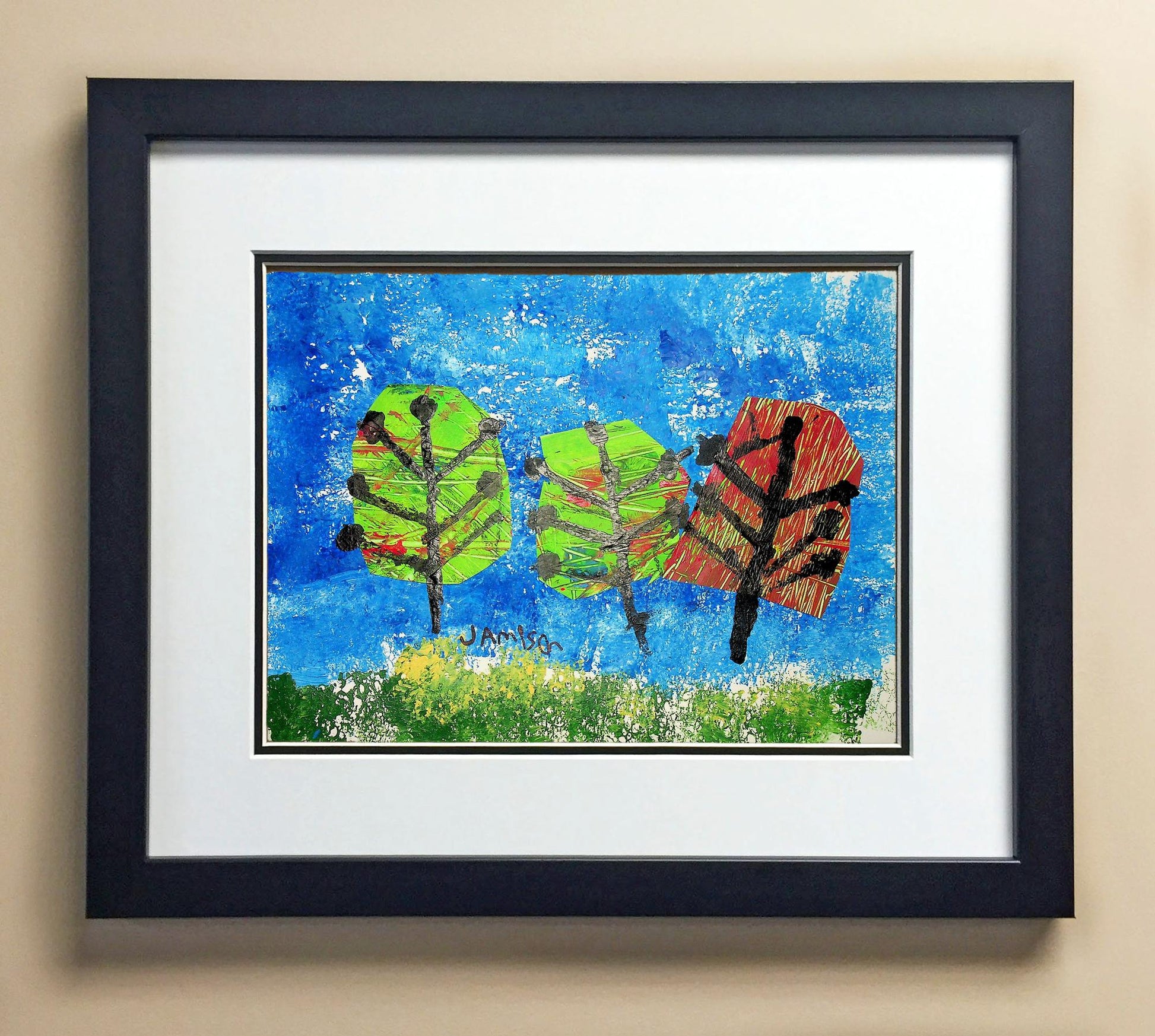 Included with the purchase is the Students Artwork, Frame, double matboard, shatter proof plexiglass, and a ready to hang backerboard with turnbuttons