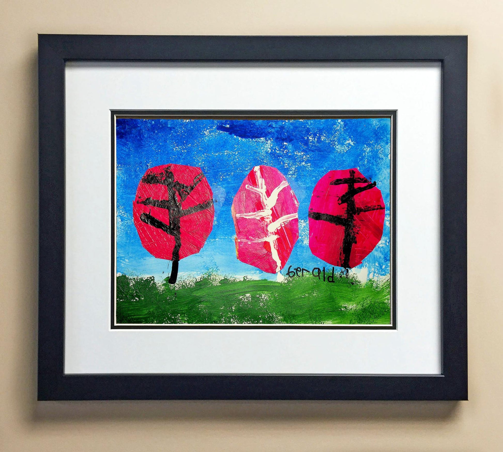 Included with the purchase is the Students Artwork, Frame, double matboard, shatter proof plexiglass, and a ready to hang backerboard with turnbuttons