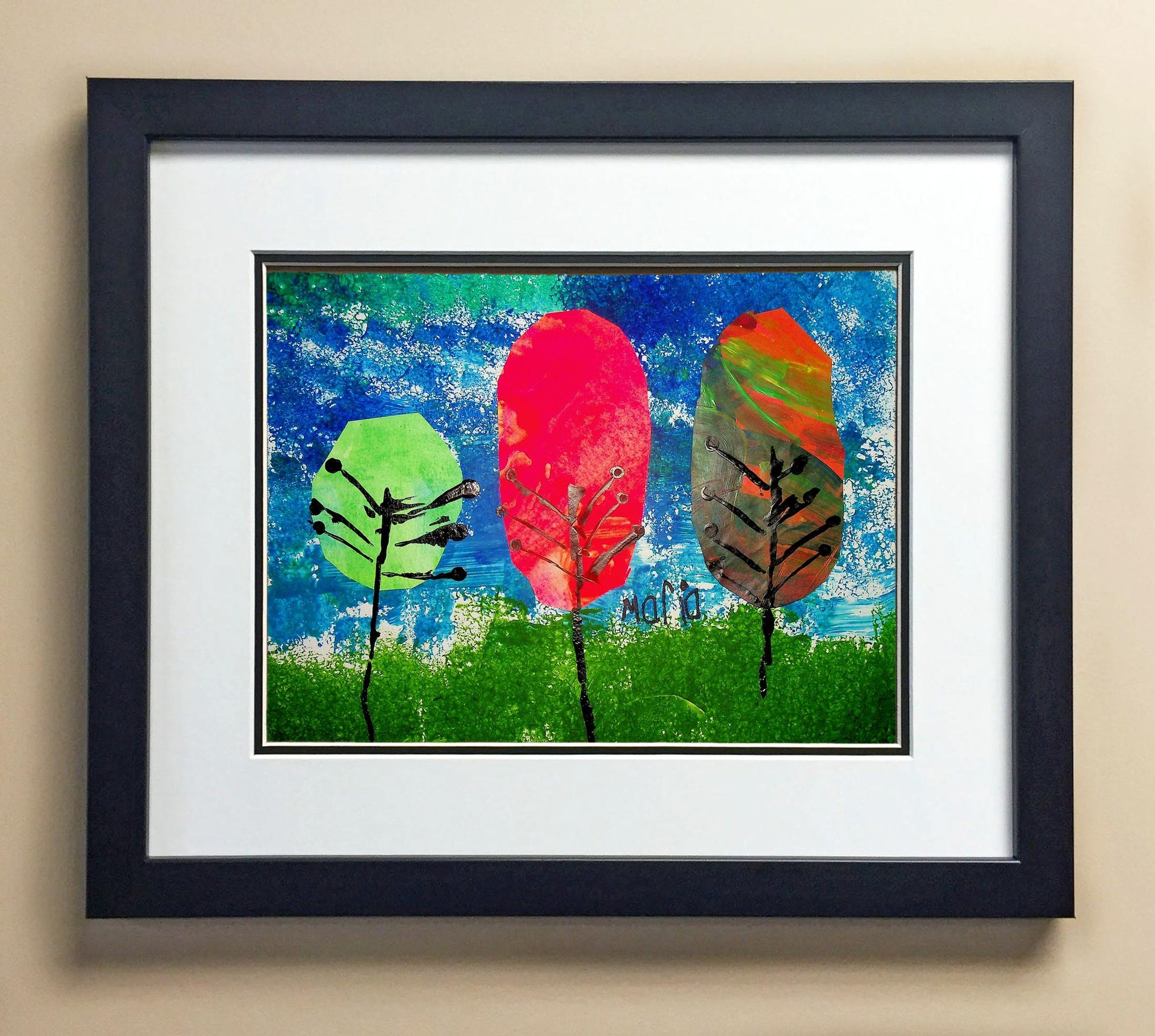 Included with the purchase is the Students Artwork, Frame, double matboard, shatter proof plexiglass, and a ready to hang backerboard with turnbuttons