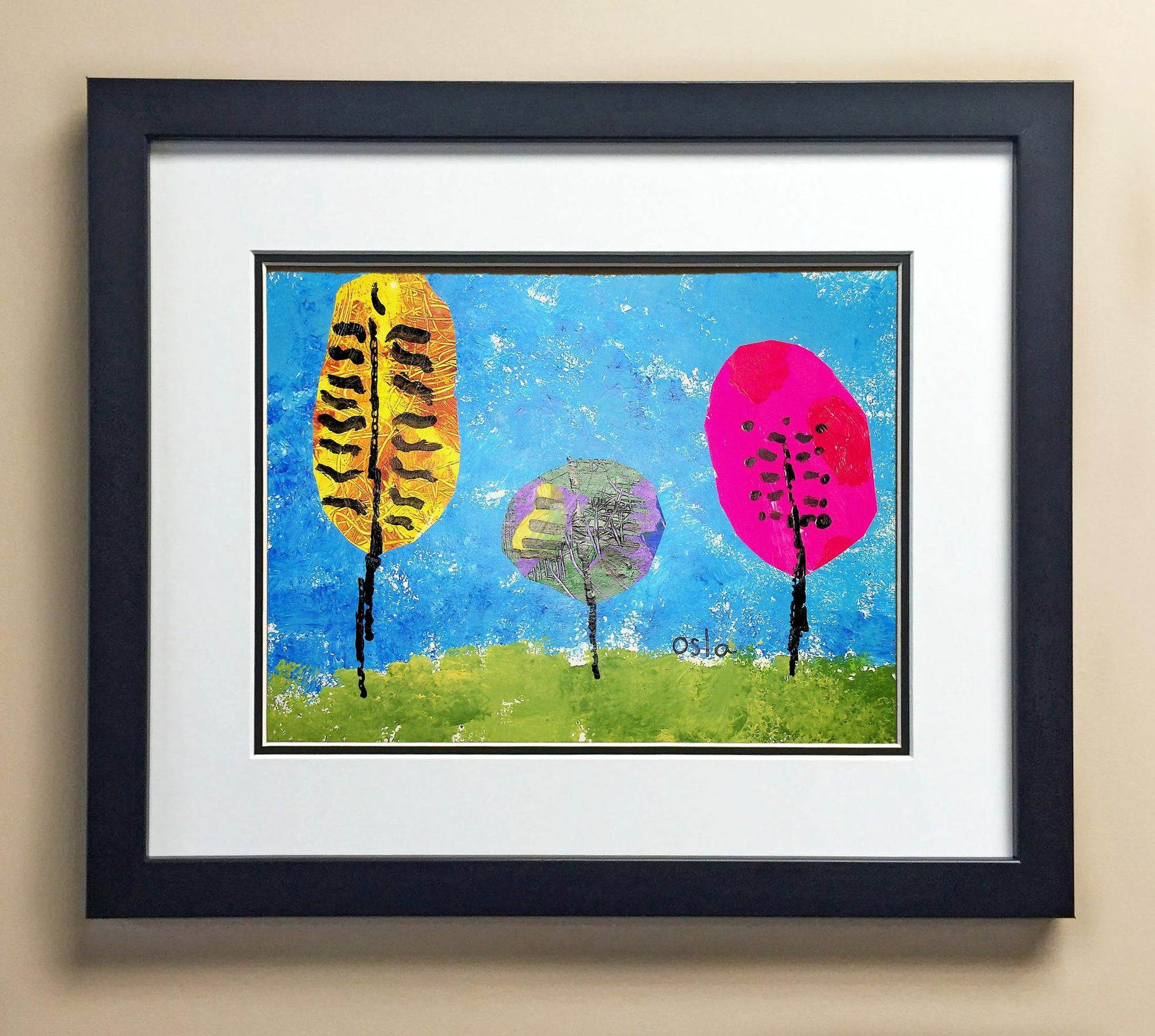 Included with the purchase is the Students Artwork, Frame, double matboard, shatter proof plexiglass, and a ready to hang backerboard with turnbuttons