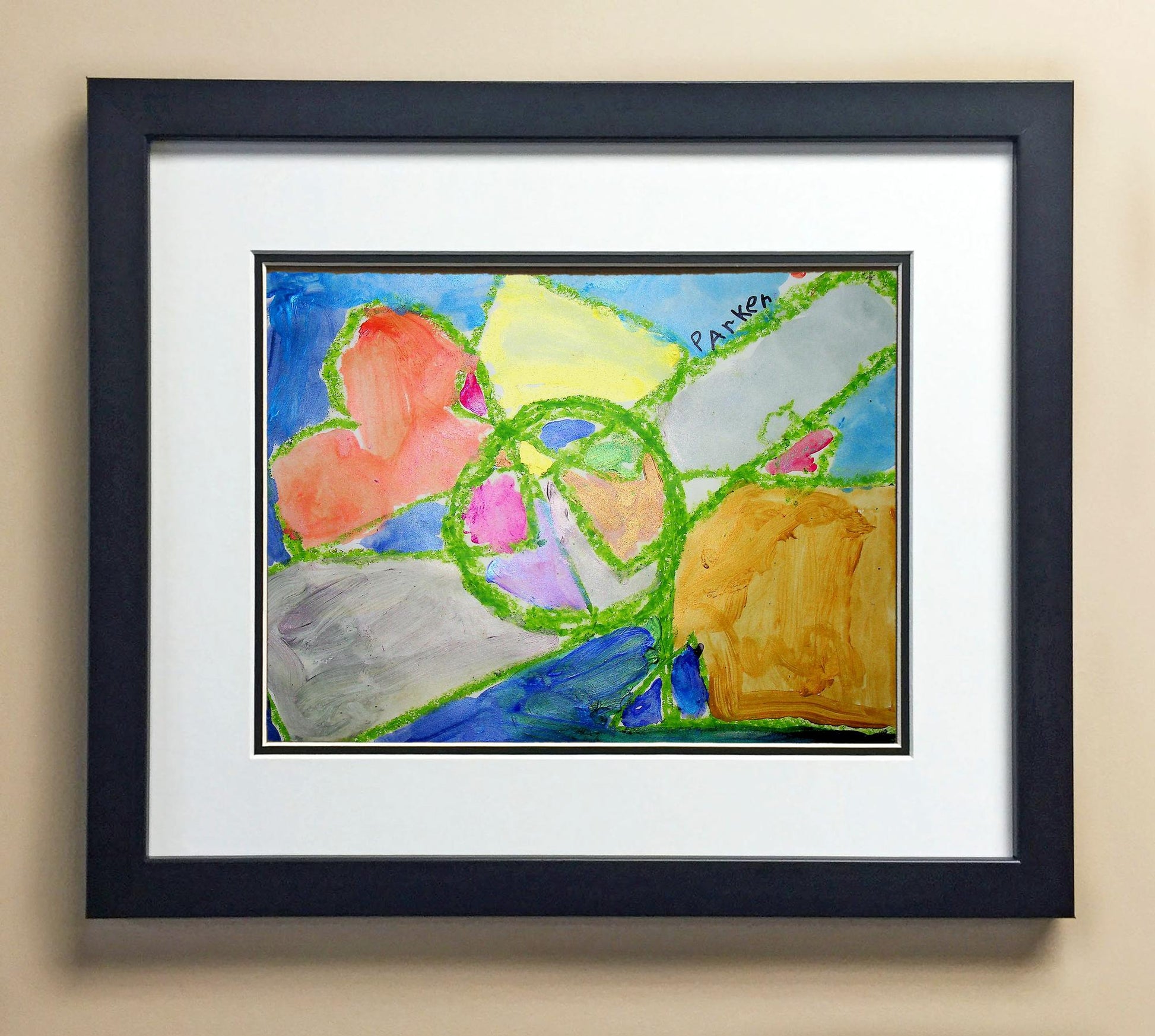 Included with the purchase is the Students Artwork, Frame, double matboard, shatter proof plexiglass, and a ready to hang backerboard with turnbuttons