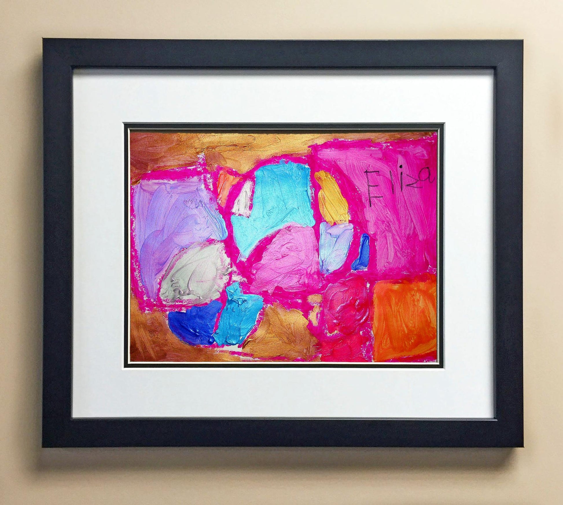 Included with the purchase is the Students Artwork, Frame, double matboard, shatter proof plexiglass, and a ready to hang backerboard with turnbuttons