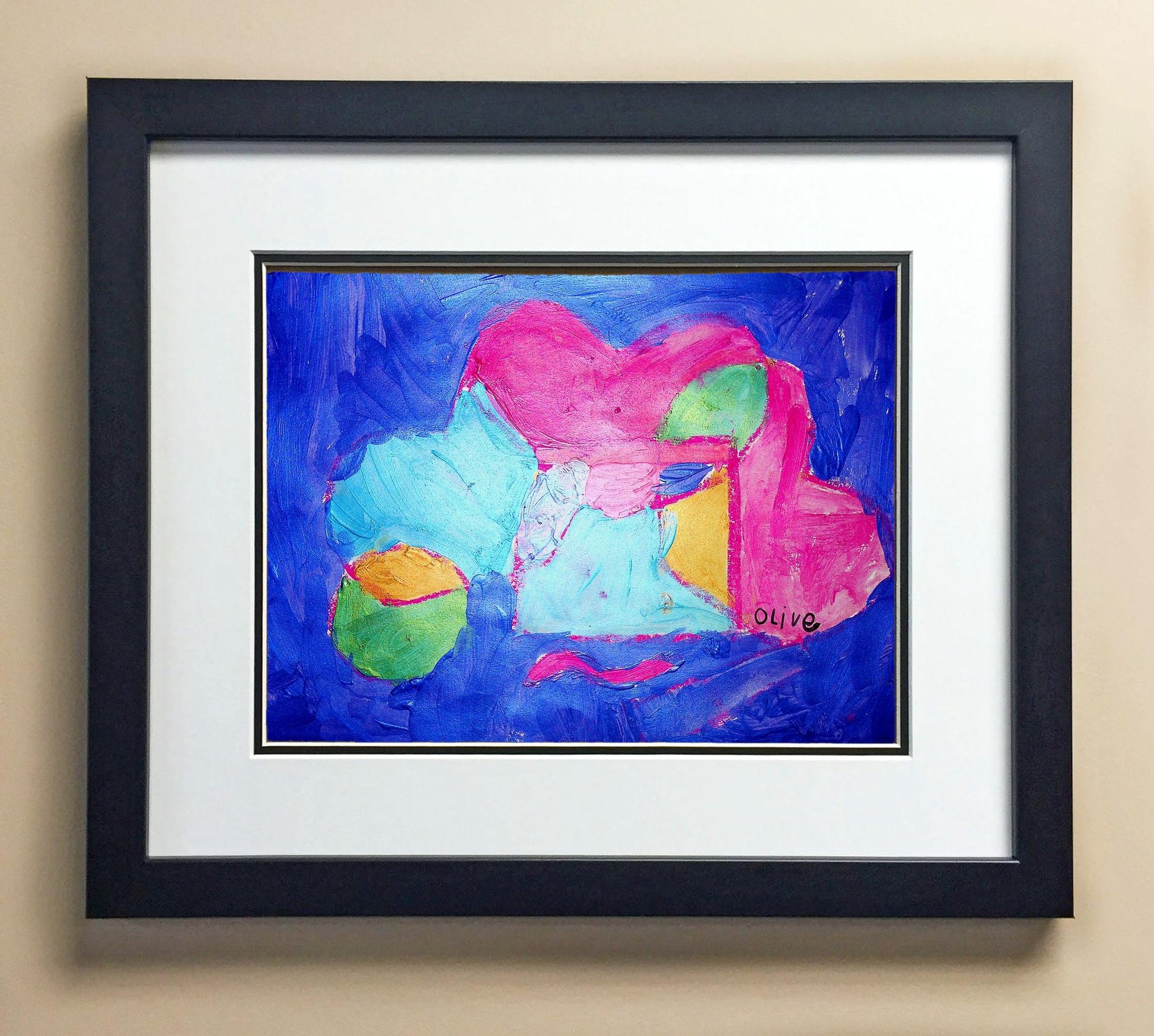 Included with the purchase is the Students Artwork, Frame, double matboard, shatter proof plexiglass, and a ready to hang backerboard with turnbuttons