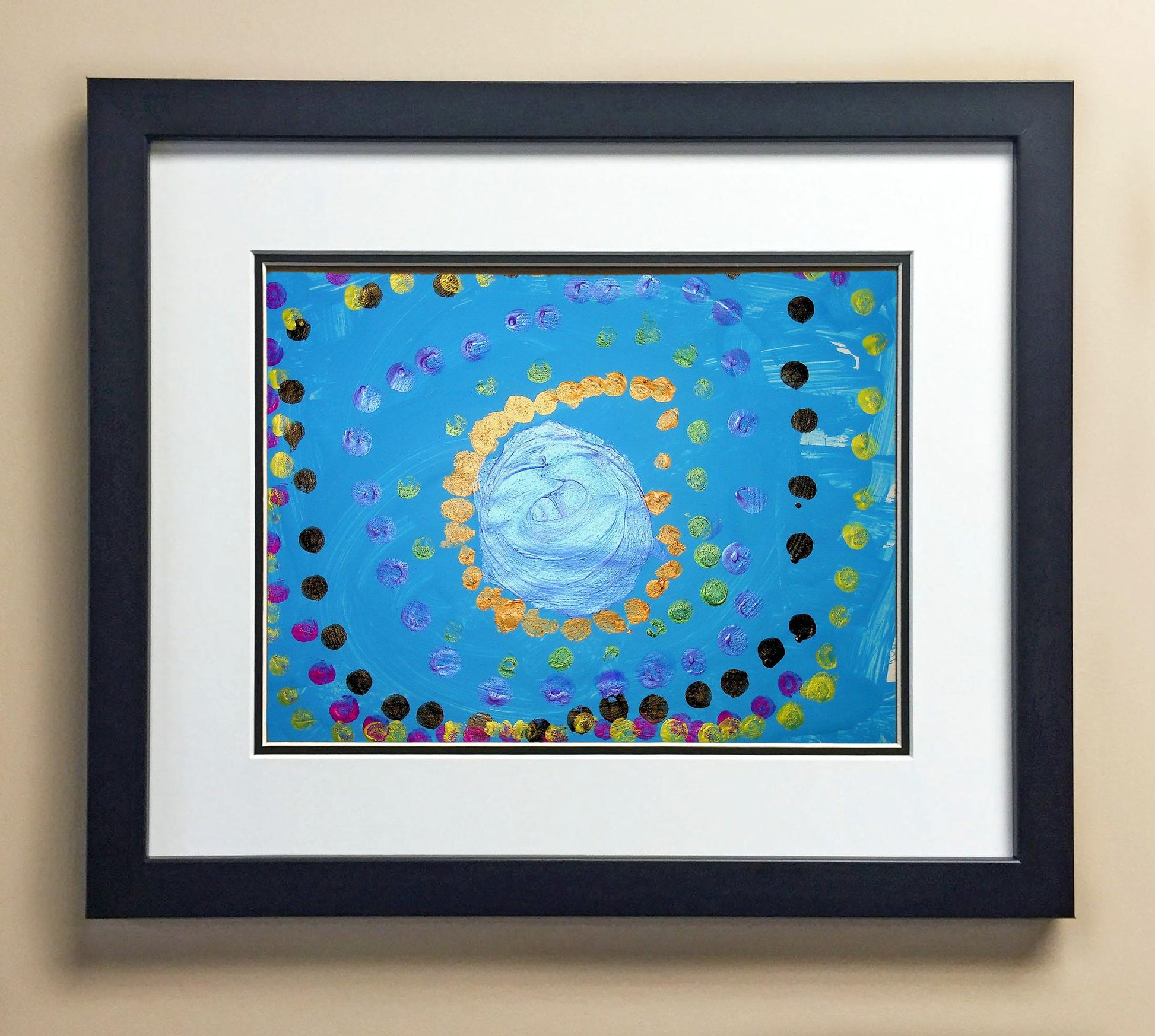 Included with the purchase is the Students Artwork, Frame, double matboard, shatter proof plexiglass, and a ready to hang backerboard with turnbuttons