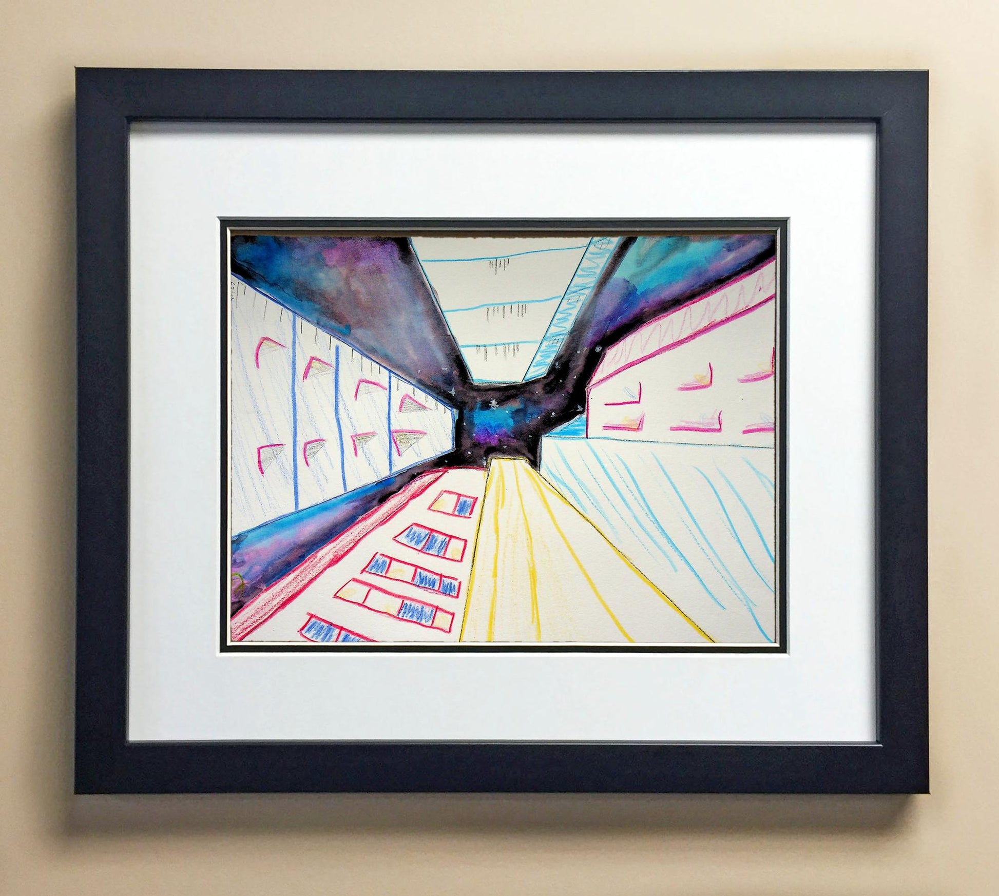 Included with the purchase is the Students Artwork, Frame, double matboard, shatter proof plexiglass, and a ready to hang backerboard with turnbuttons