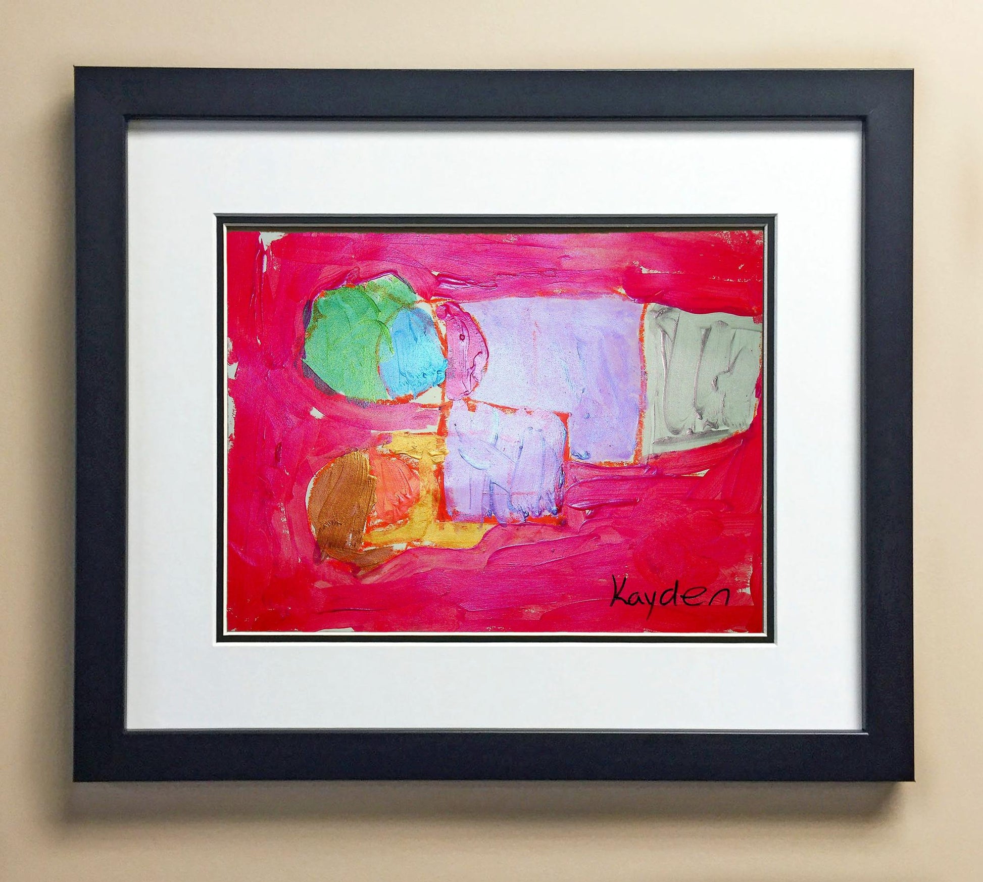 Included with the purchase is the Students Artwork, Frame, double matboard, shatter proof plexiglass, and a ready to hang backerboard with turnbuttons
