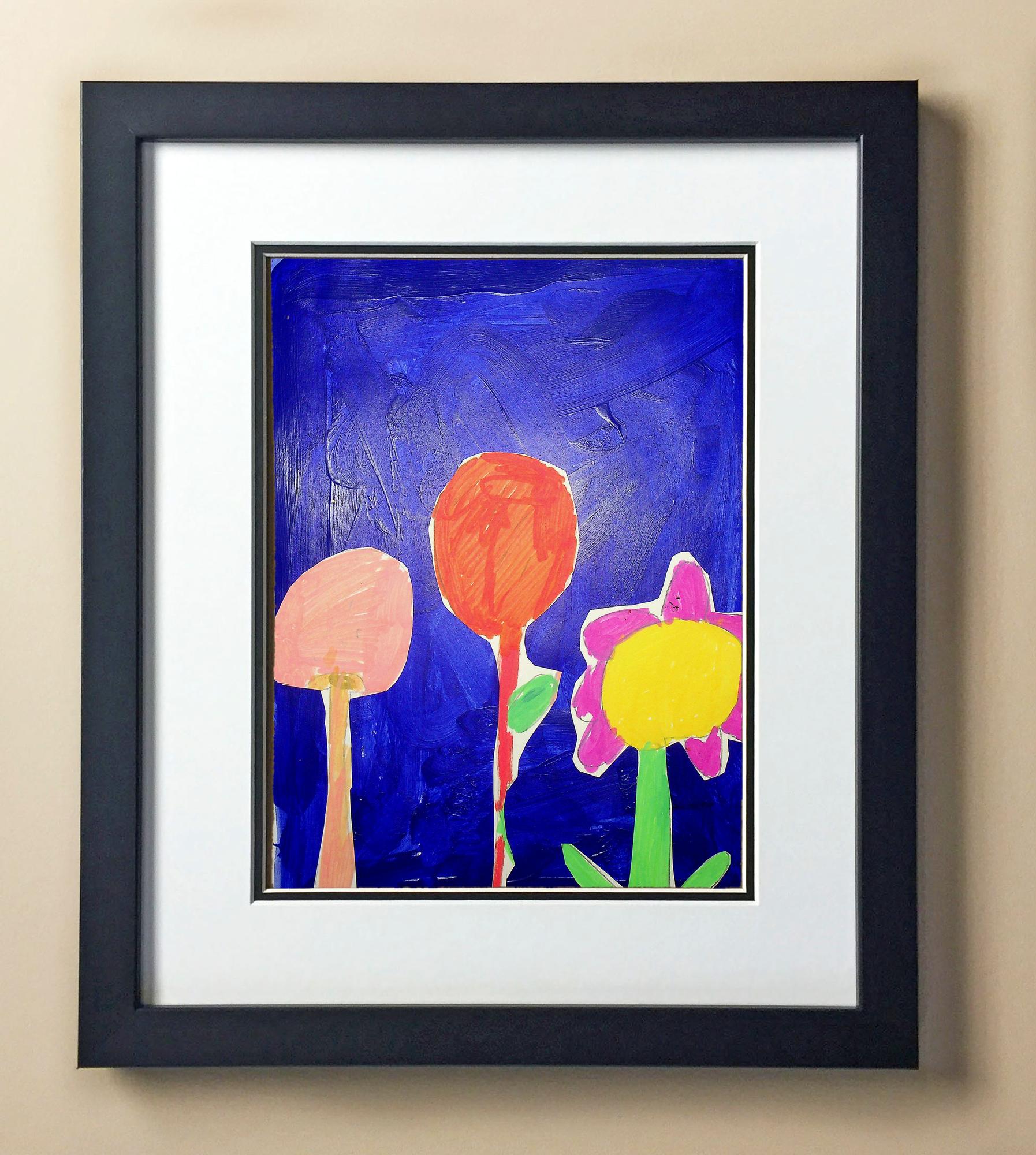 Included with the purchase is the Students Artwork, Frame, double matboard, shatter proof plexiglass, and a ready to hang backerboard with turnbuttons