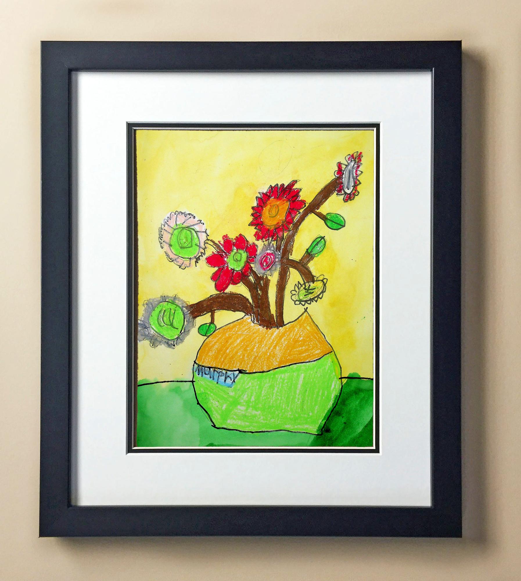 Included with the purchase is the Students Artwork, Frame, double matboard, shatter proof plexiglass, and a ready to hang backerboard with turnbuttons