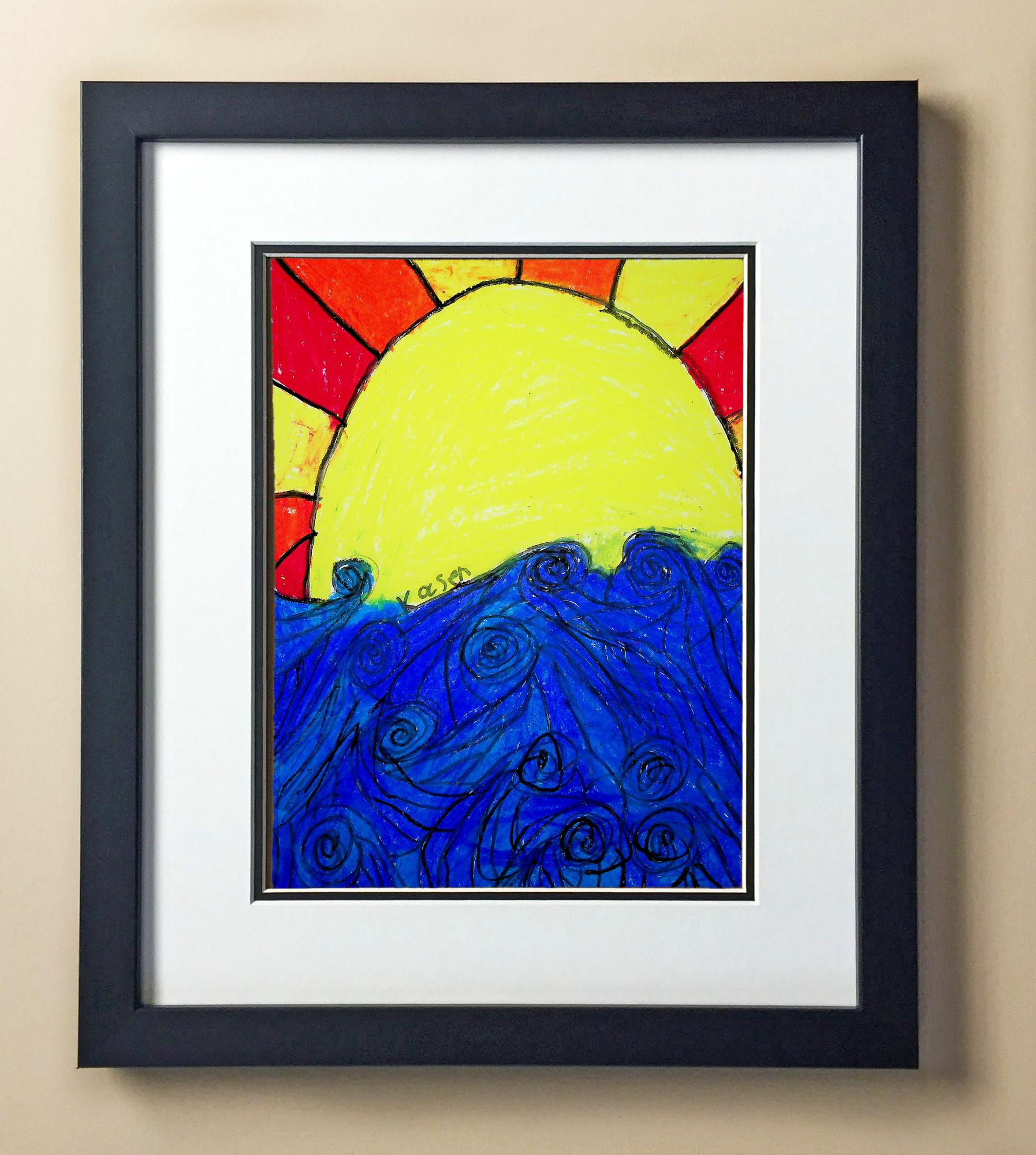 Included with the purchase is the Students Artwork, Frame, double matboard, shatter proof plexiglass, and a ready to hang backerboard with turnbuttons