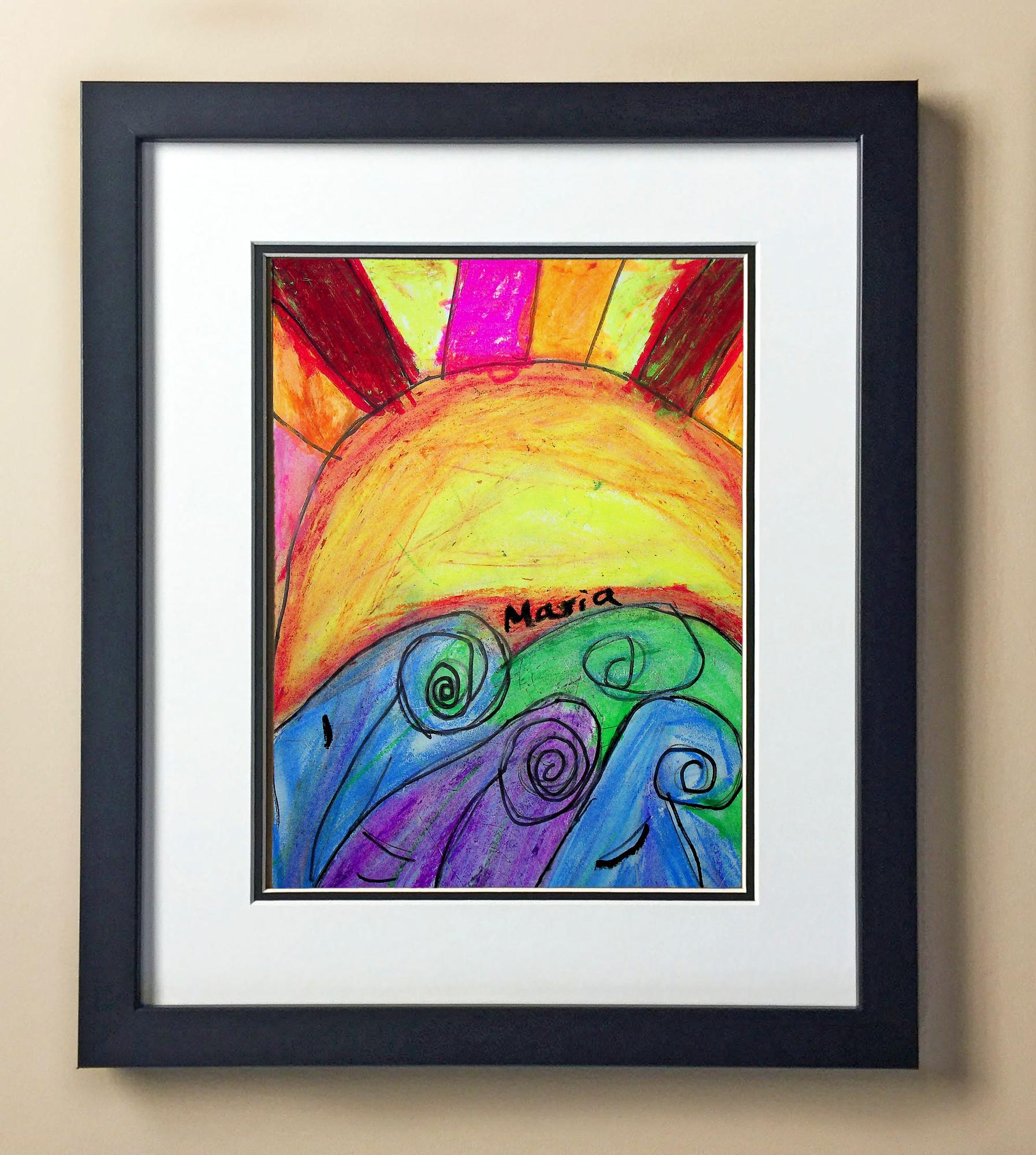 Included with the purchase is the Students Artwork, Frame, double matboard, shatter proof plexiglass, and a ready to hang backerboard with turnbuttons