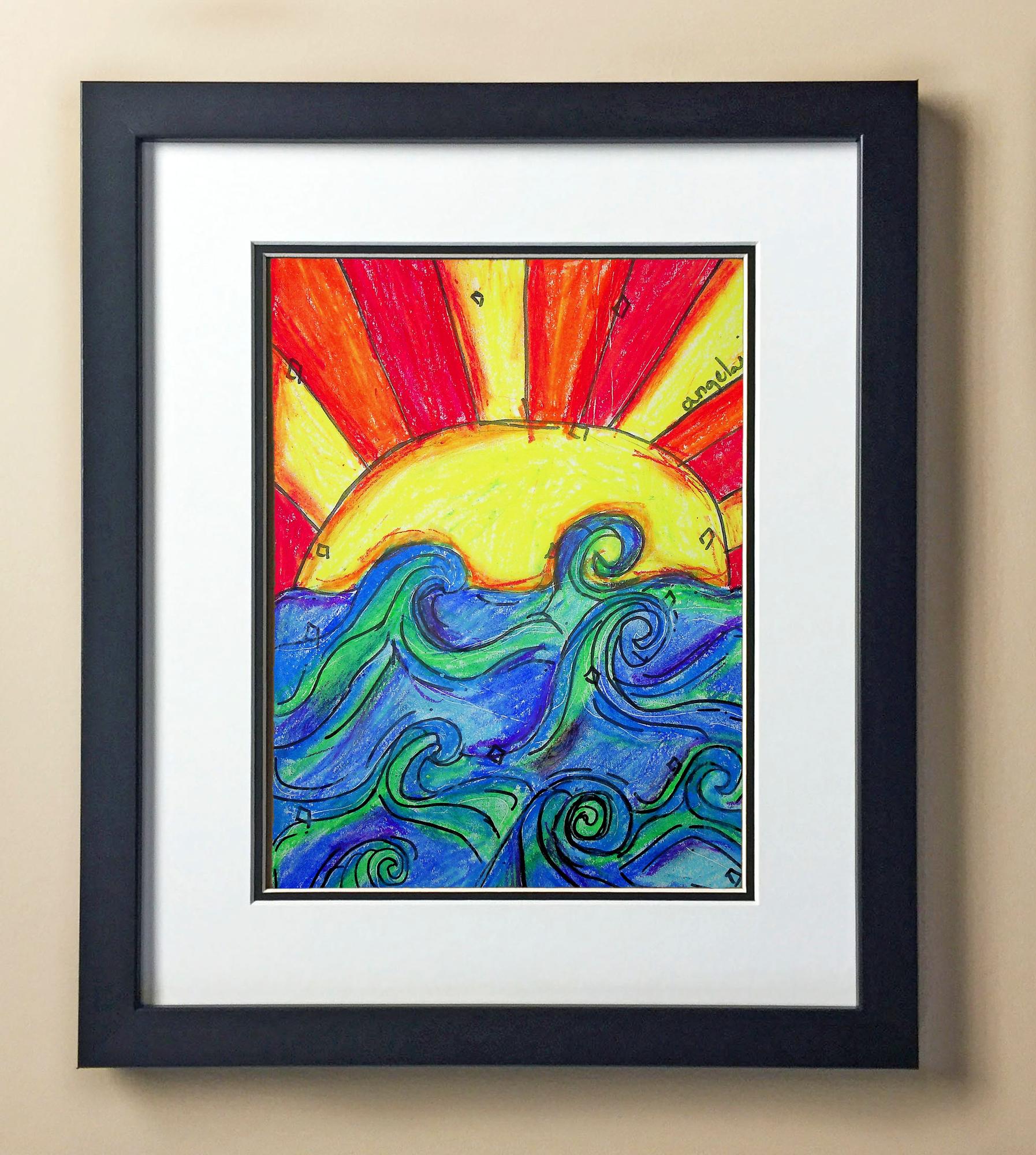 Included with the purchase is the Students Artwork, Frame, double matboard, shatter proof plexiglass, and a ready to hang backerboard with turnbuttons