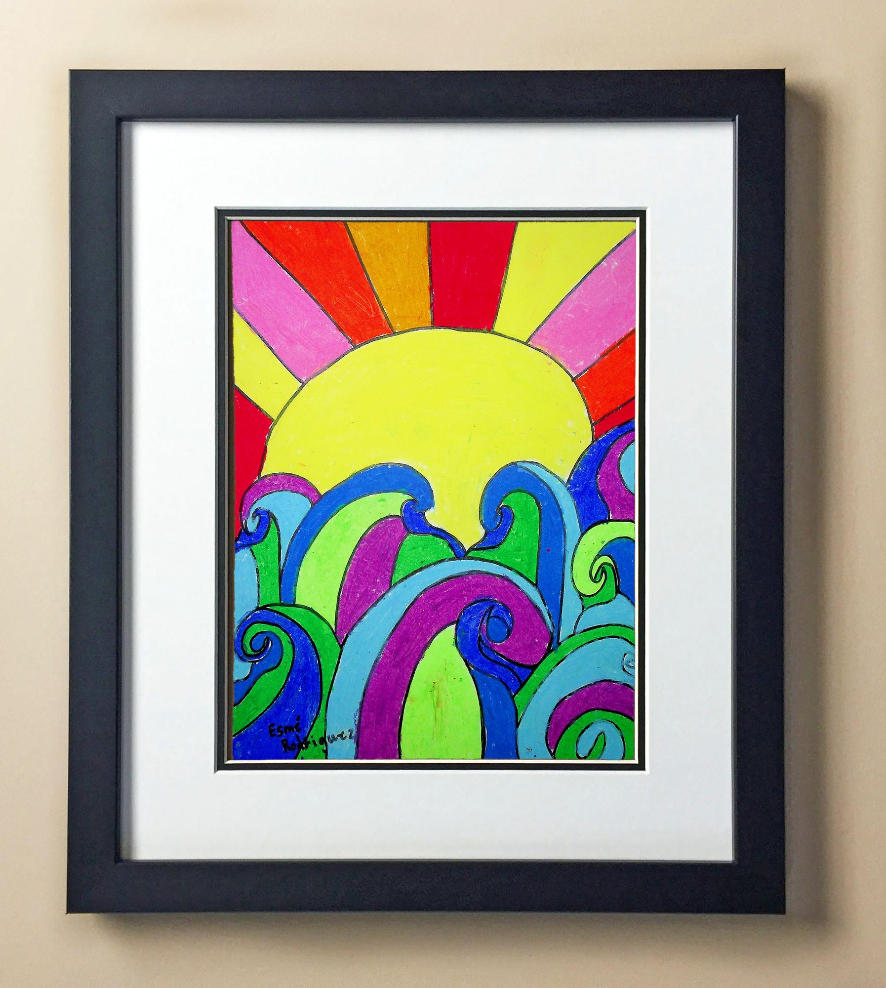 Included with the purchase is the Students Artwork, Frame, double matboard, shatter proof plexiglass, and a ready to hang backerboard with turnbuttons