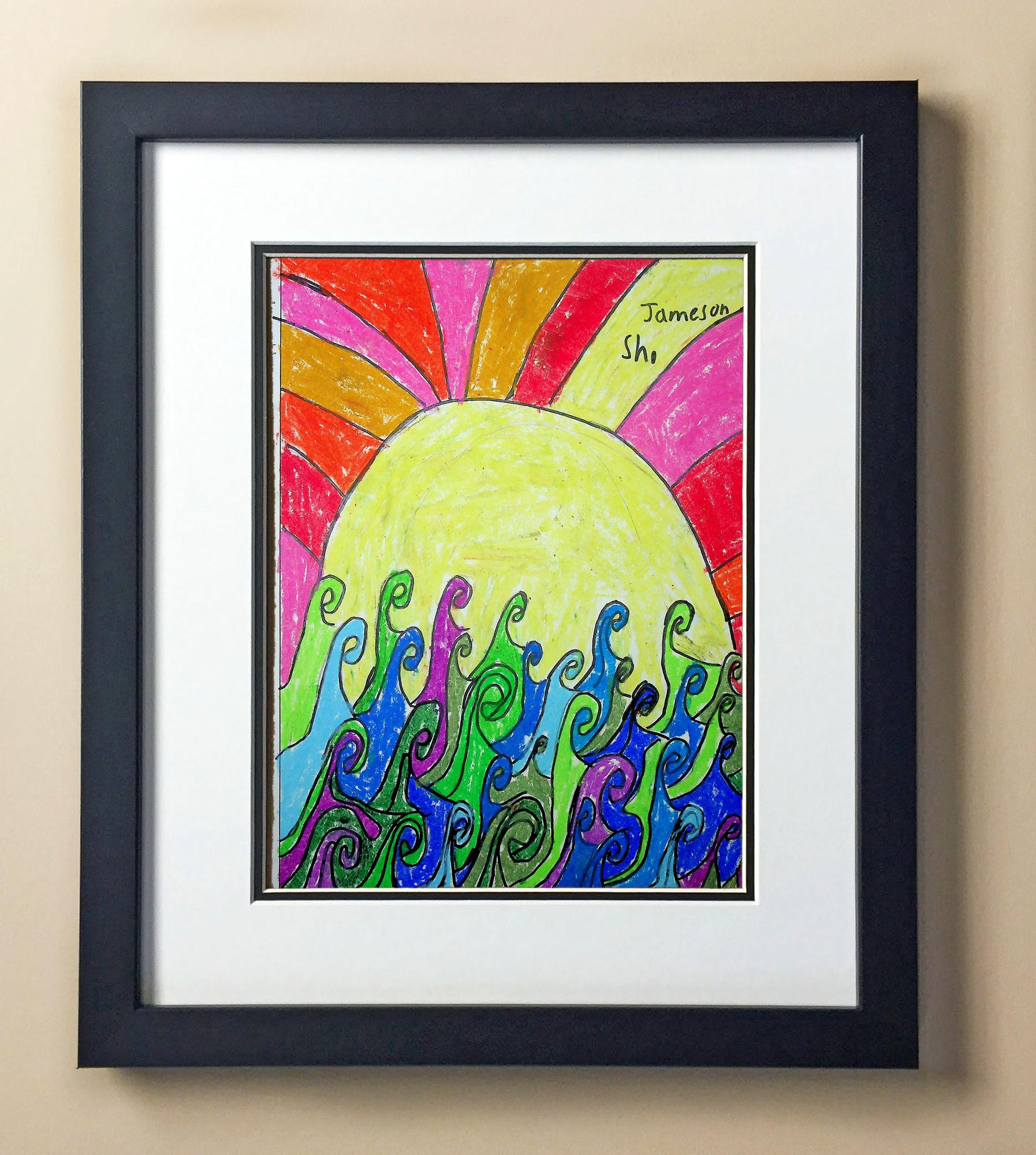 Included with the purchase is the Students Artwork, Frame, double matboard, shatter proof plexiglass, and a ready to hang backerboard with turnbuttons