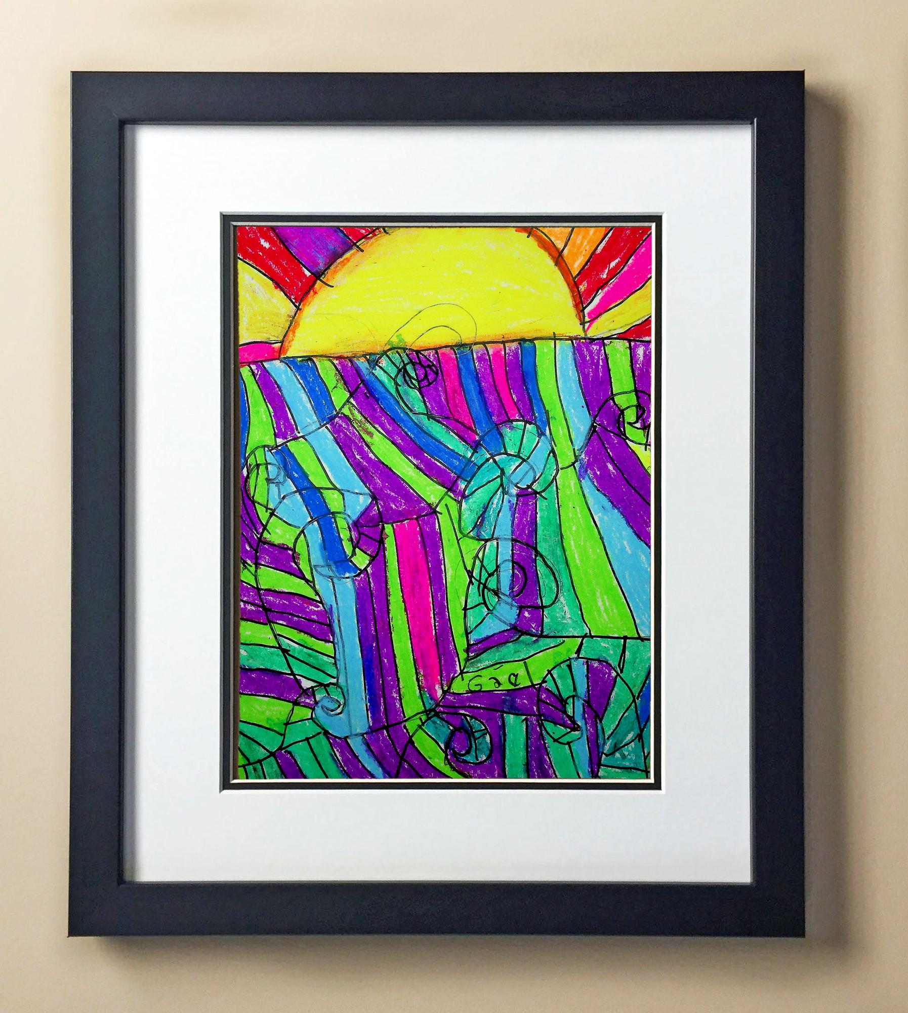 Included with the purchase is the Students Artwork, Frame, double matboard, shatter proof plexiglass, and a ready to hang backerboard with turnbuttons