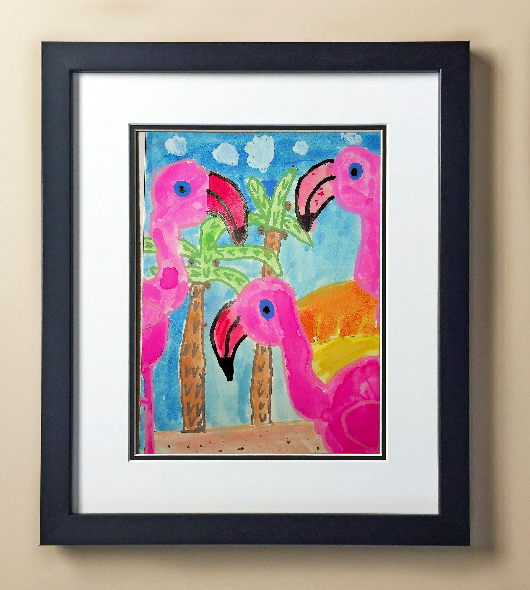 Included with the purchase is the Students Artwork, Frame, double matboard, shatter proof plexiglass, and a ready to hang backerboard with turnbuttons