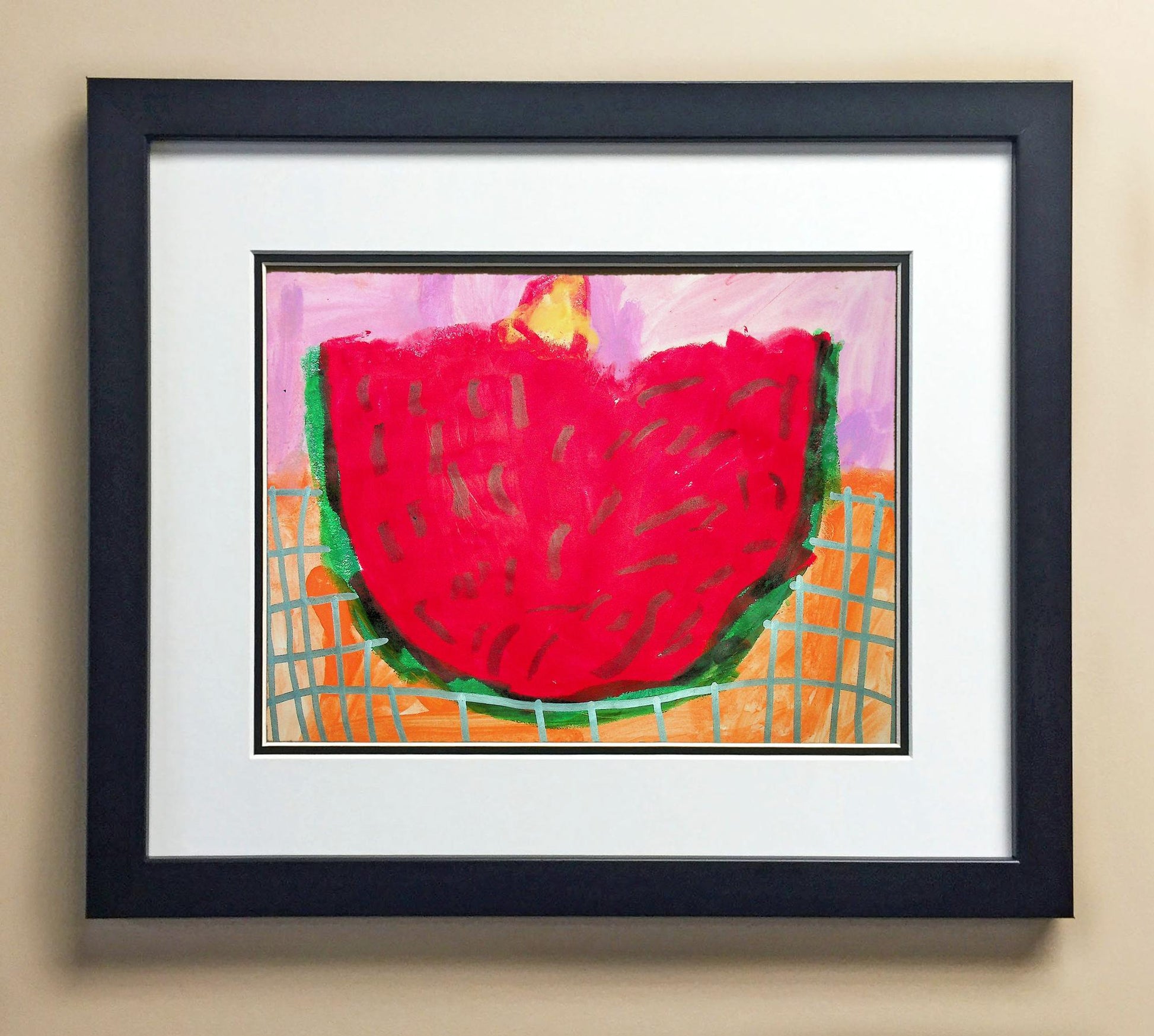 Included with the purchase is the Students Artwork, Frame, double matboard, shatter proof plexiglass, and a ready to hang backerboard with turnbuttons