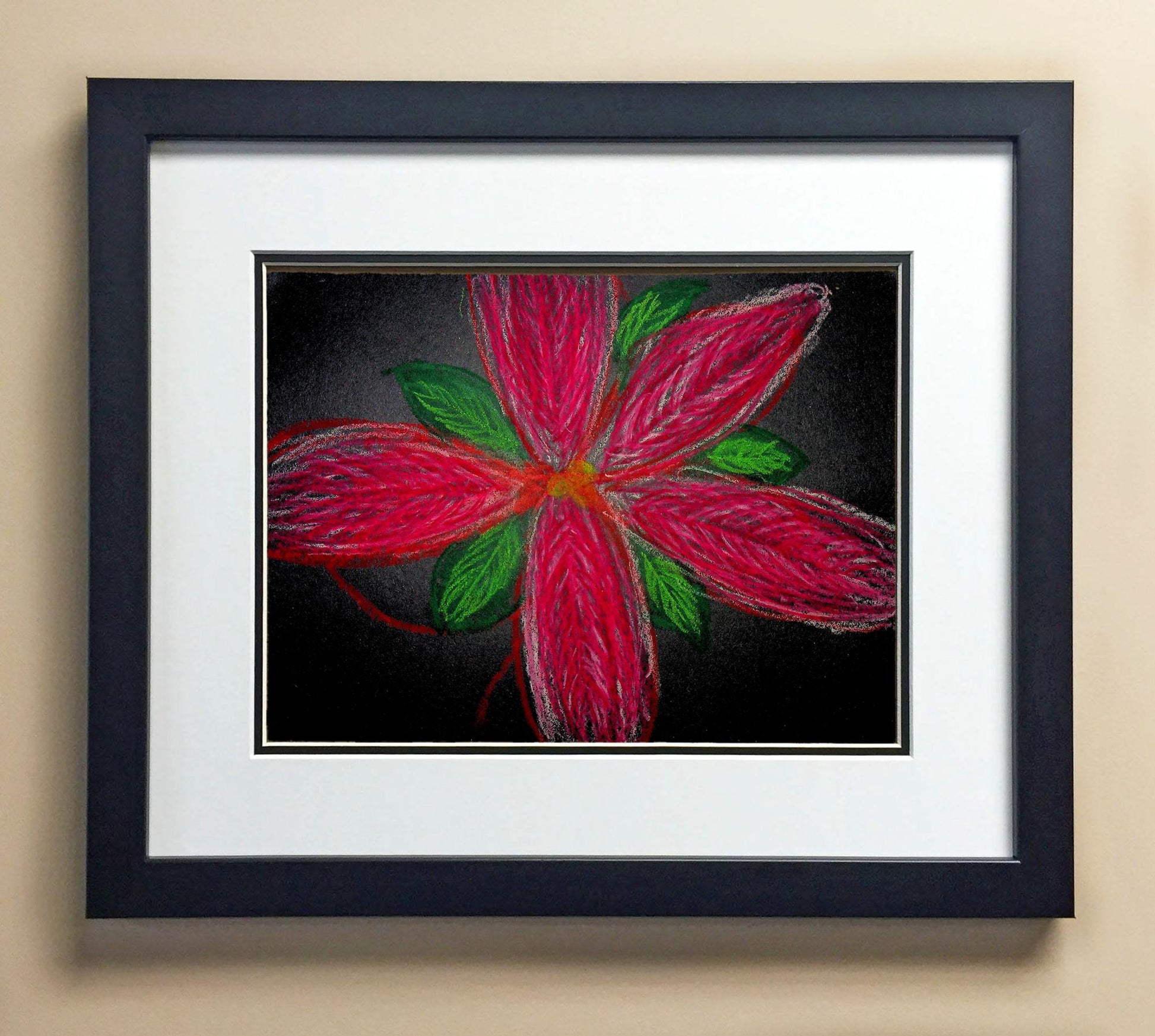 Included with the purchase is the Students Artwork, Frame, double matboard, shatter proof plexiglass, and a ready to hang backerboard with turnbuttons
