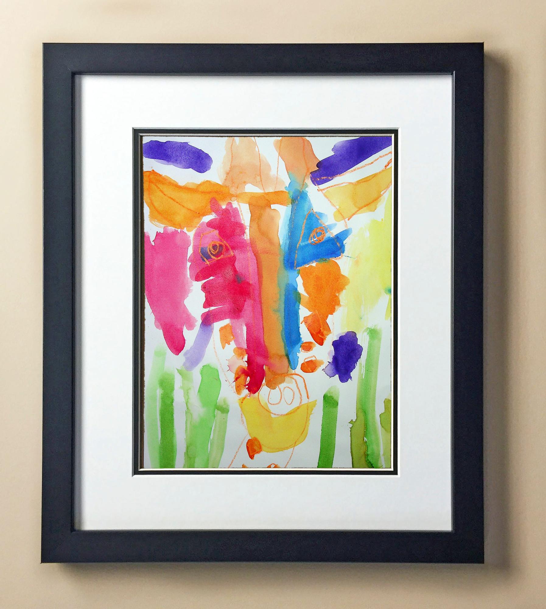 Included with the purchase is the Students Artwork, Frame, double matboard, shatter proof plexiglass, and a ready to hang backerboard with turnbuttons