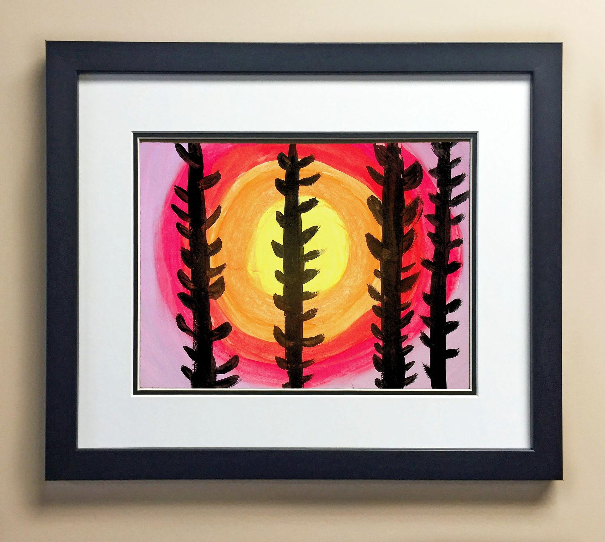 Included with the purchase is the Students Artwork, Frame, double matboard, shatter proof plexiglass, and a ready to hang backerboard with turnbuttons
