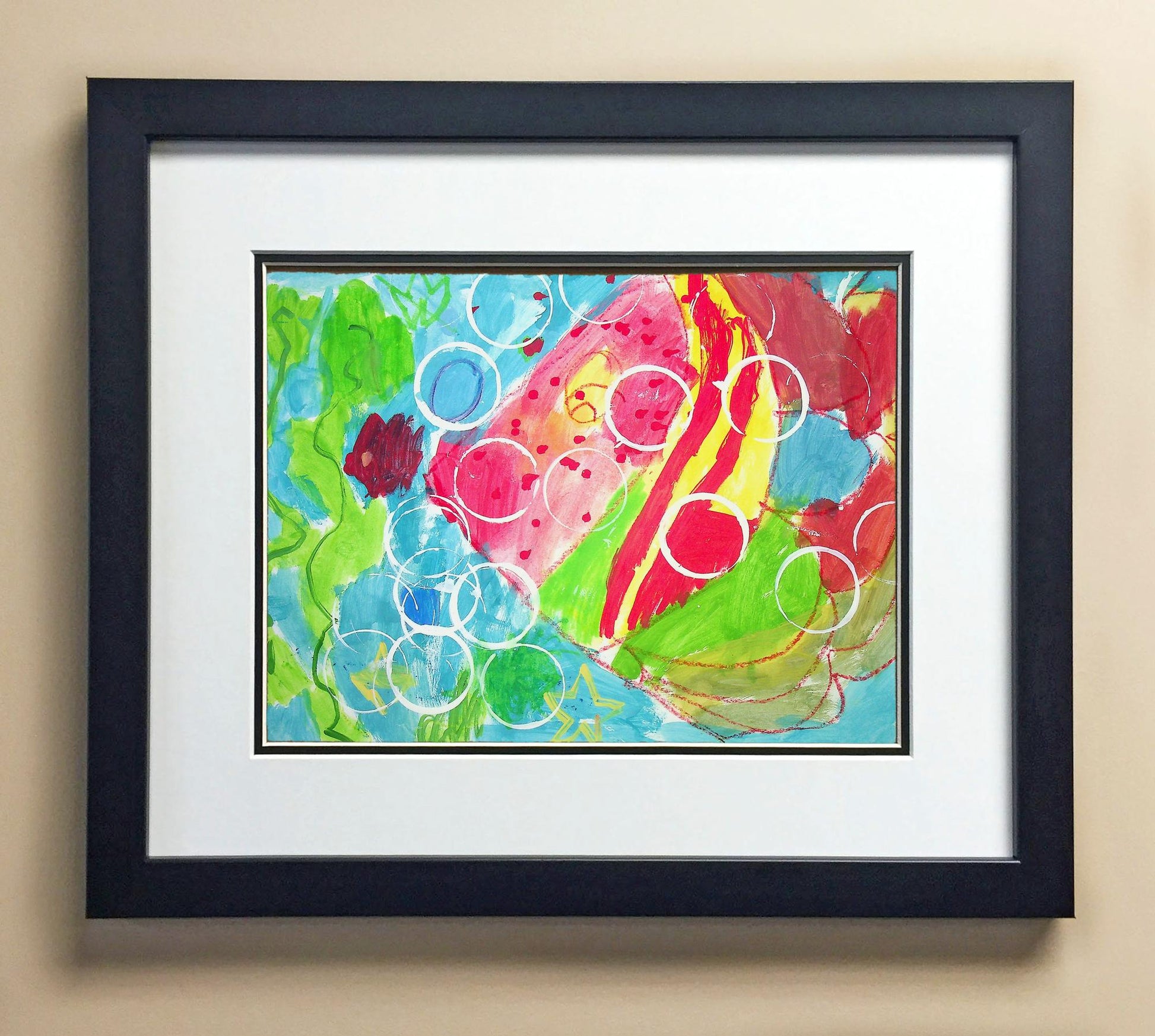 Included with the purchase is the Students Artwork, Frame, double matboard, shatter proof plexiglass, and a ready to hang backerboard with turnbuttons