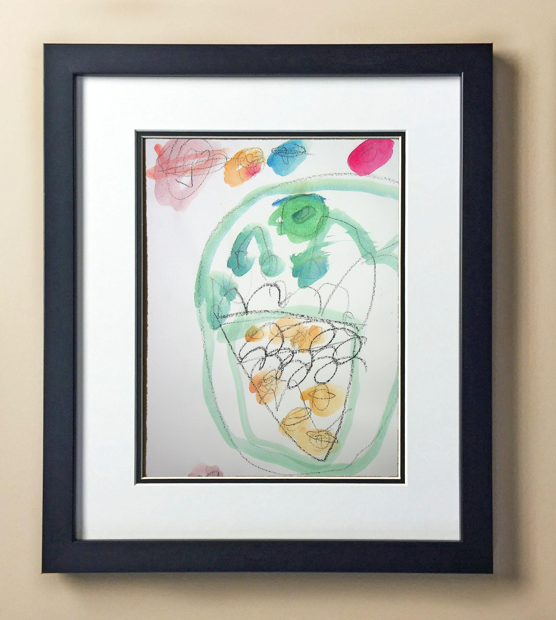 Included with the purchase is the Students Artwork, Frame, double matboard, shatter proof plexiglass, and a ready to hang backerboard with turnbuttons