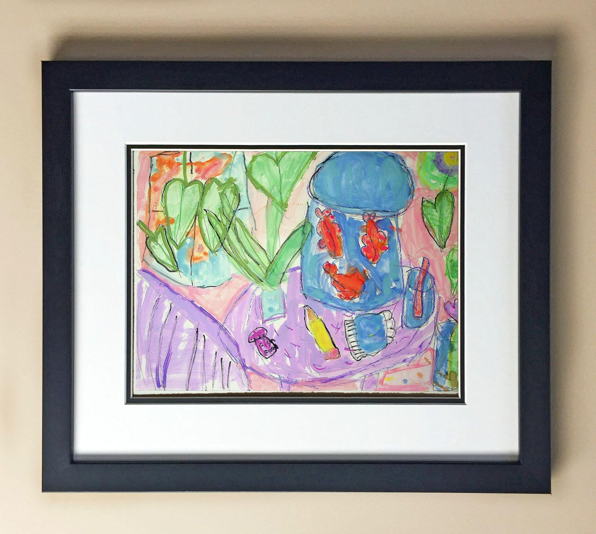 Included with the purchase is the Students Artwork, Frame, double matboard, shatter proof plexiglass, and a ready to hang backerboard with turnbuttons