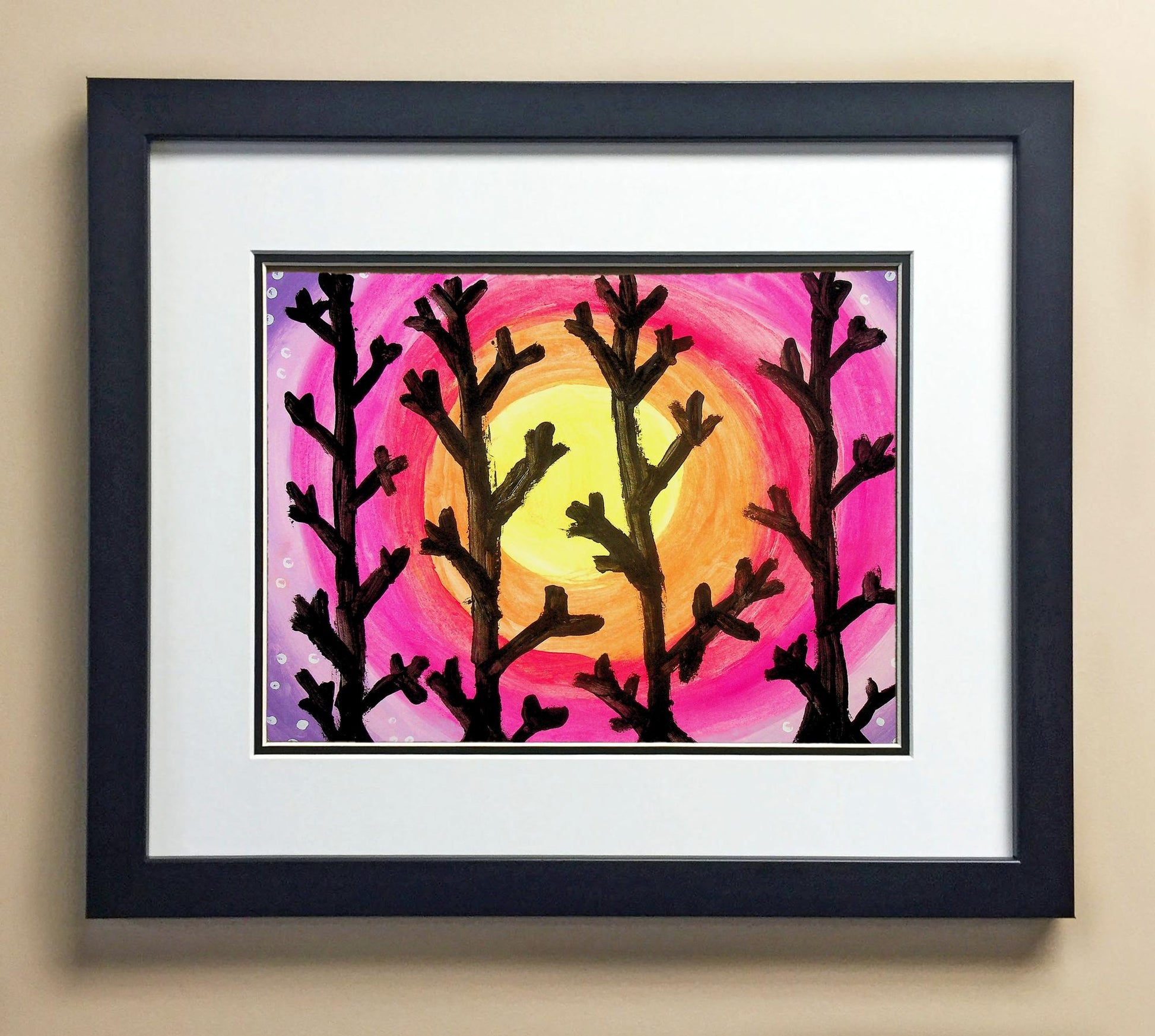 Included with the purchase is the Students Artwork, Frame, double matboard, shatter proof plexiglass, and a ready to hang backerboard with turnbuttons