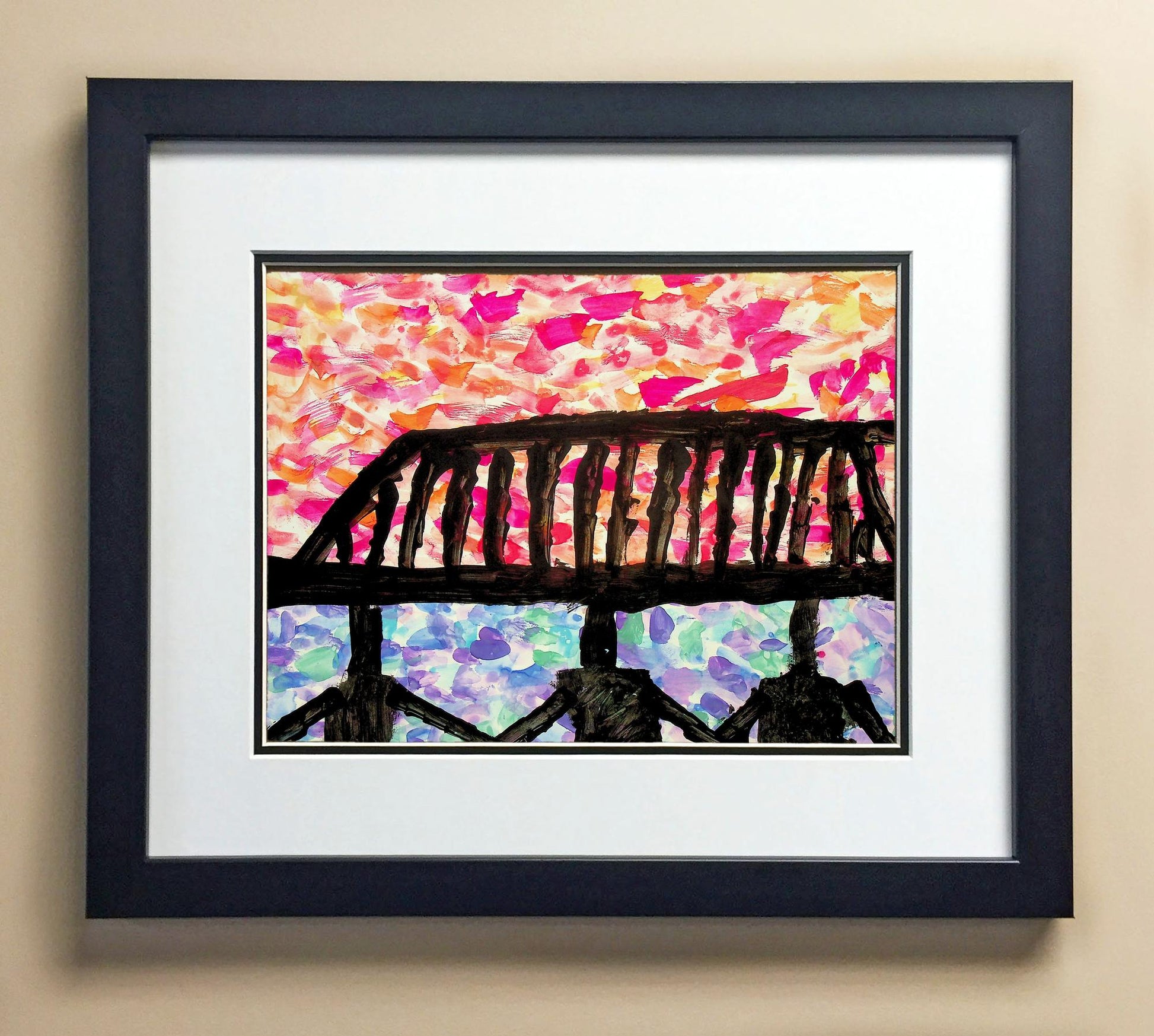 Included with the purchase is the Students Artwork, Frame, double matboard, shatter proof plexiglass, and a ready to hang backerboard with turnbuttons