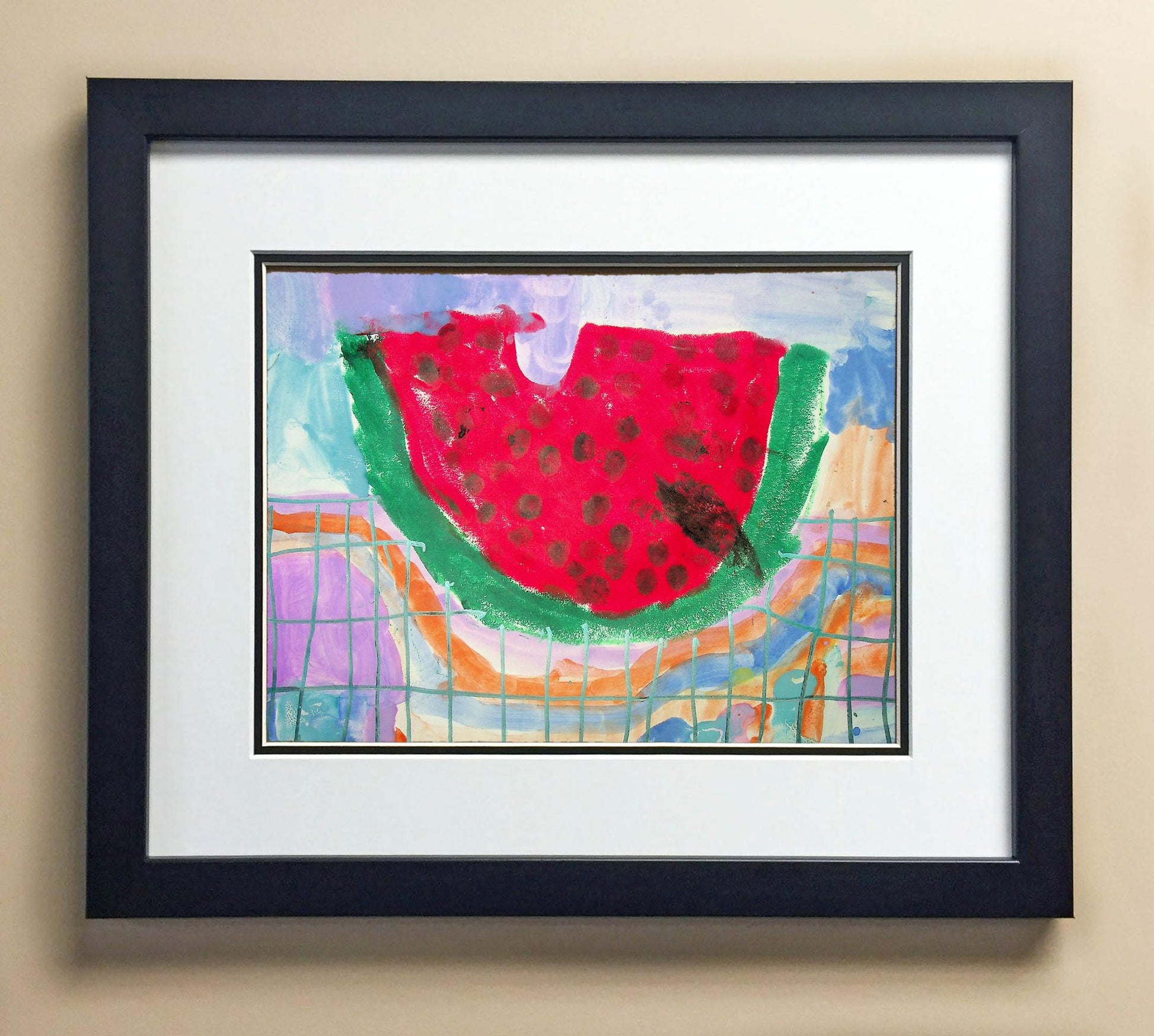 Included with the purchase is the Students Artwork, Frame, double matboard, shatter proof plexiglass, and a ready to hang backerboard with turnbuttons