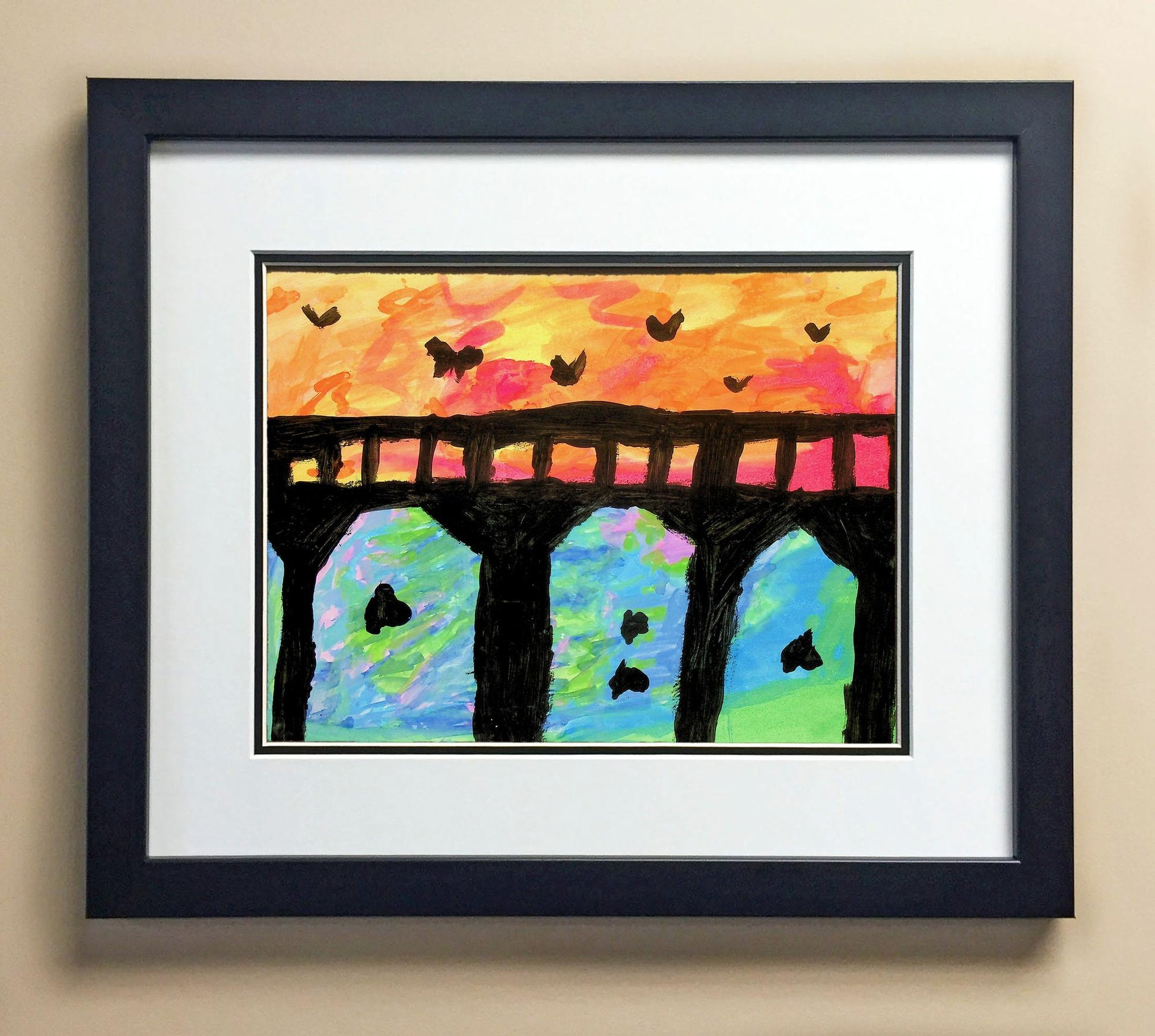 Included with the purchase is the Students Artwork, Frame, double matboard, shatter proof plexiglass, and a ready to hang backerboard with turnbuttons