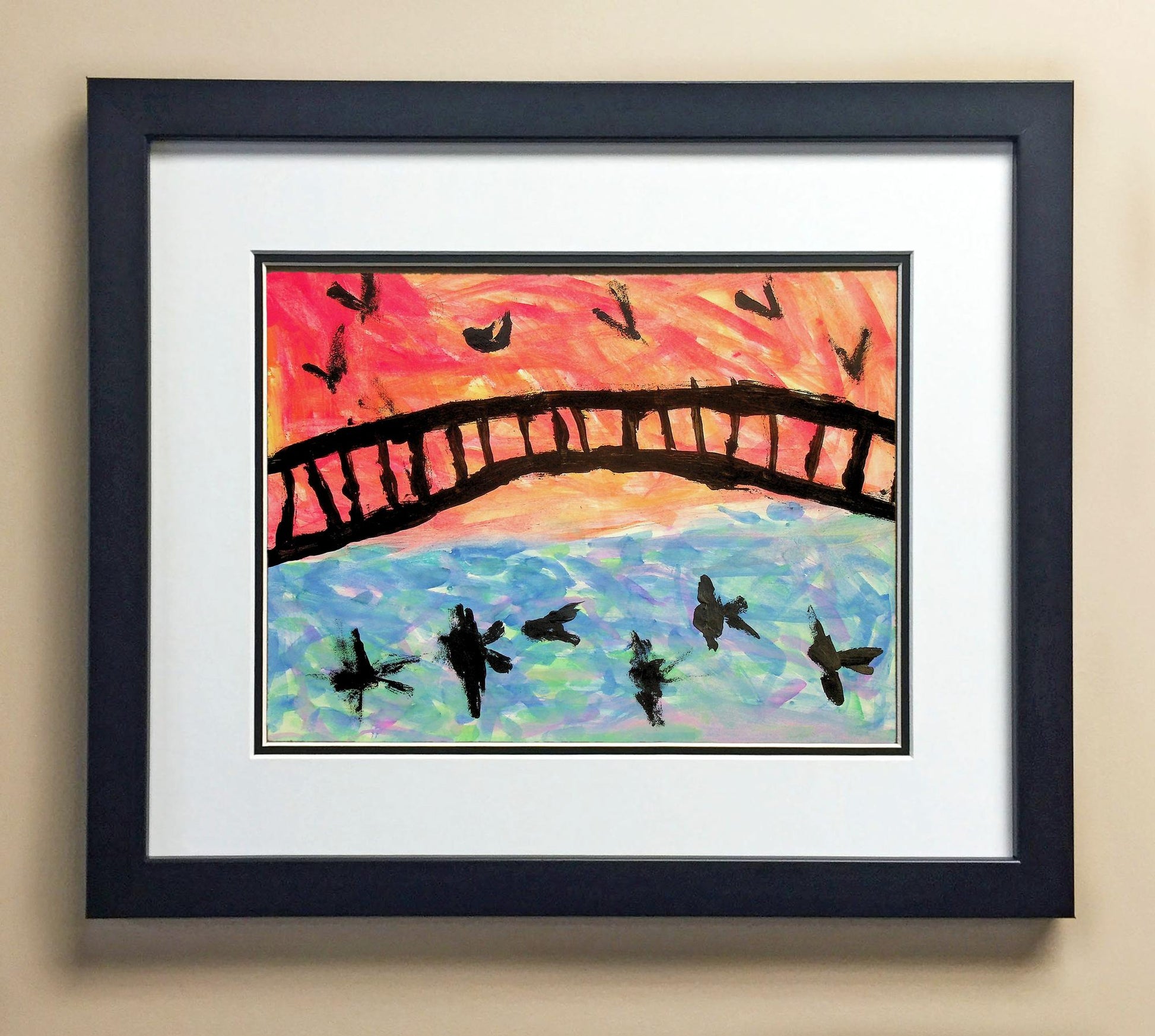 Included with the purchase is the Students Artwork, Frame, double matboard, shatter proof plexiglass, and a ready to hang backerboard with turnbuttons