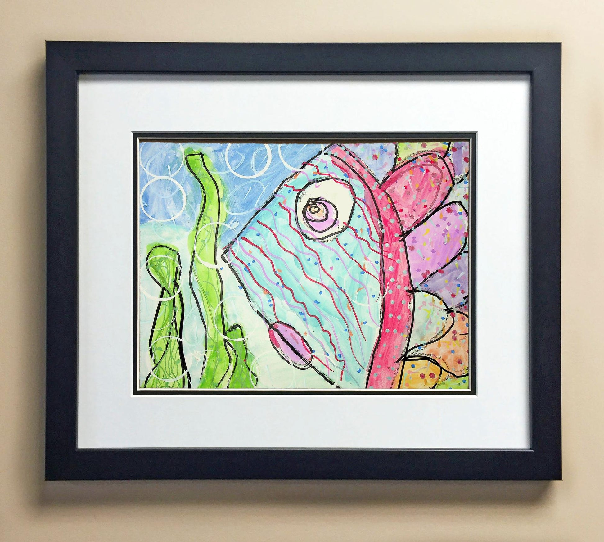 Included with the purchase is the Students Artwork, Frame, double matboard, shatter proof plexiglass, and a ready to hang backerboard with turnbuttons