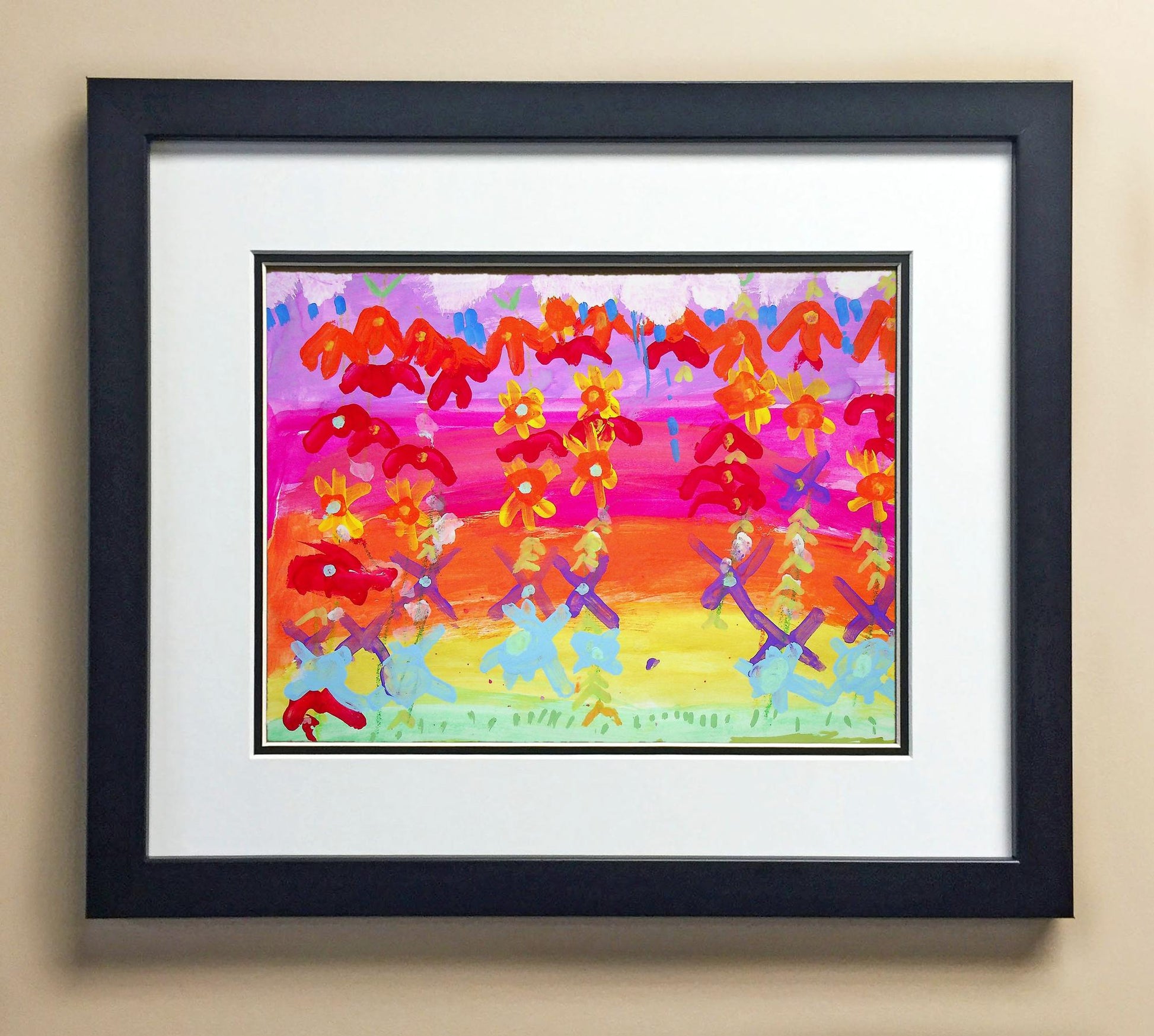 Included with the purchase is the Students Artwork, Frame, double matboard, shatter proof plexiglass, and a ready to hang backerboard with turnbuttons