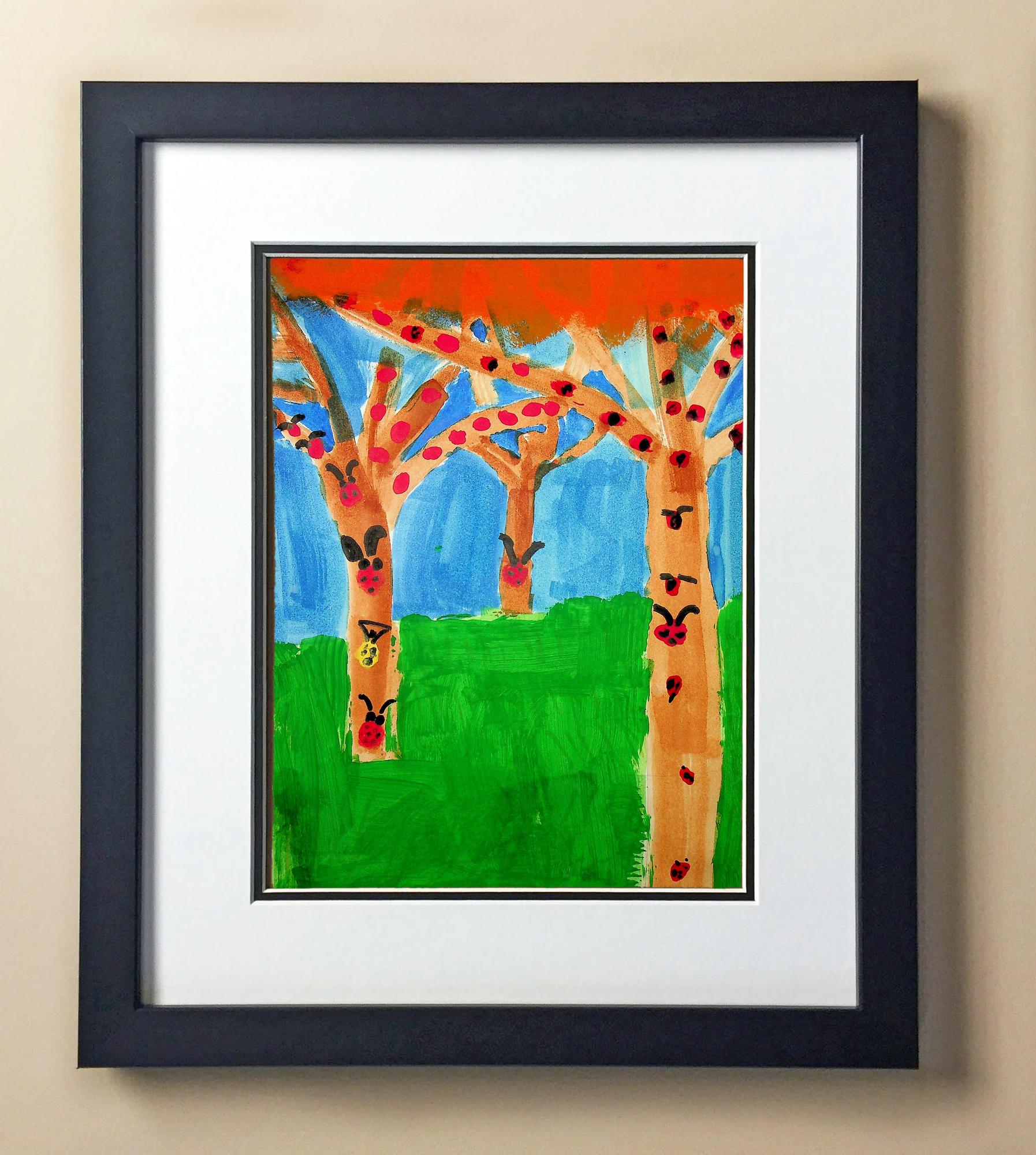Included with the purchase is the Students Artwork, Frame, double matboard, shatter proof plexiglass, and a ready to hang backerboard with turnbuttons