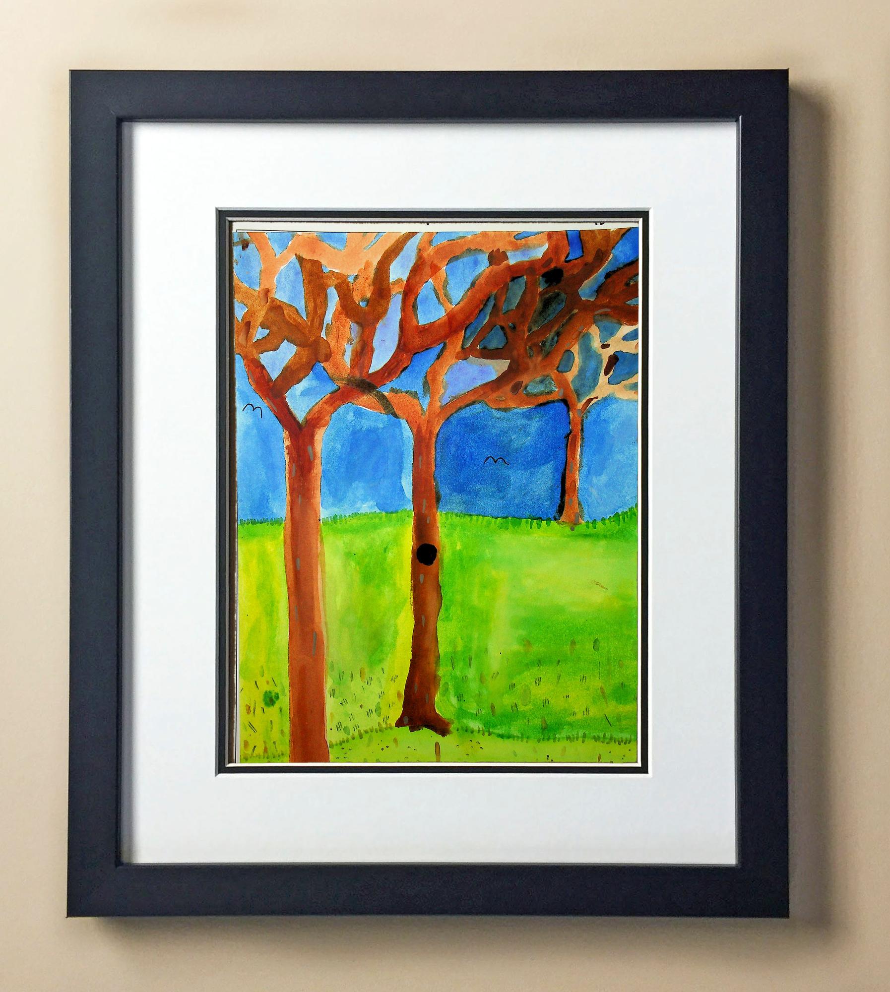 Included with the purchase is the Students Artwork, Frame, double matboard, shatter proof plexiglass, and a ready to hang backerboard with turnbuttons