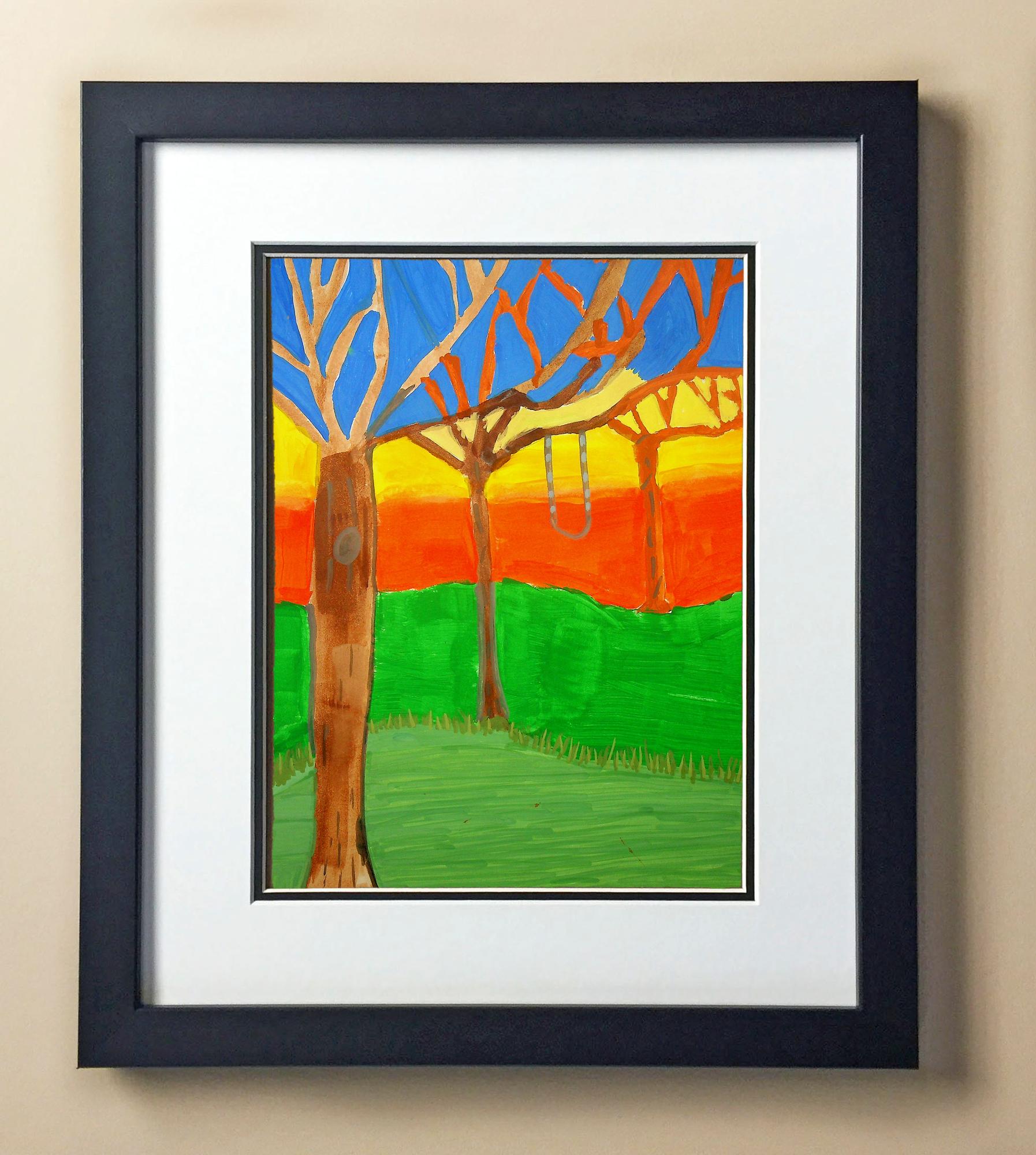 Included with the purchase is the Students Artwork, Frame, double matboard, shatter proof plexiglass, and a ready to hang backerboard with turnbuttons