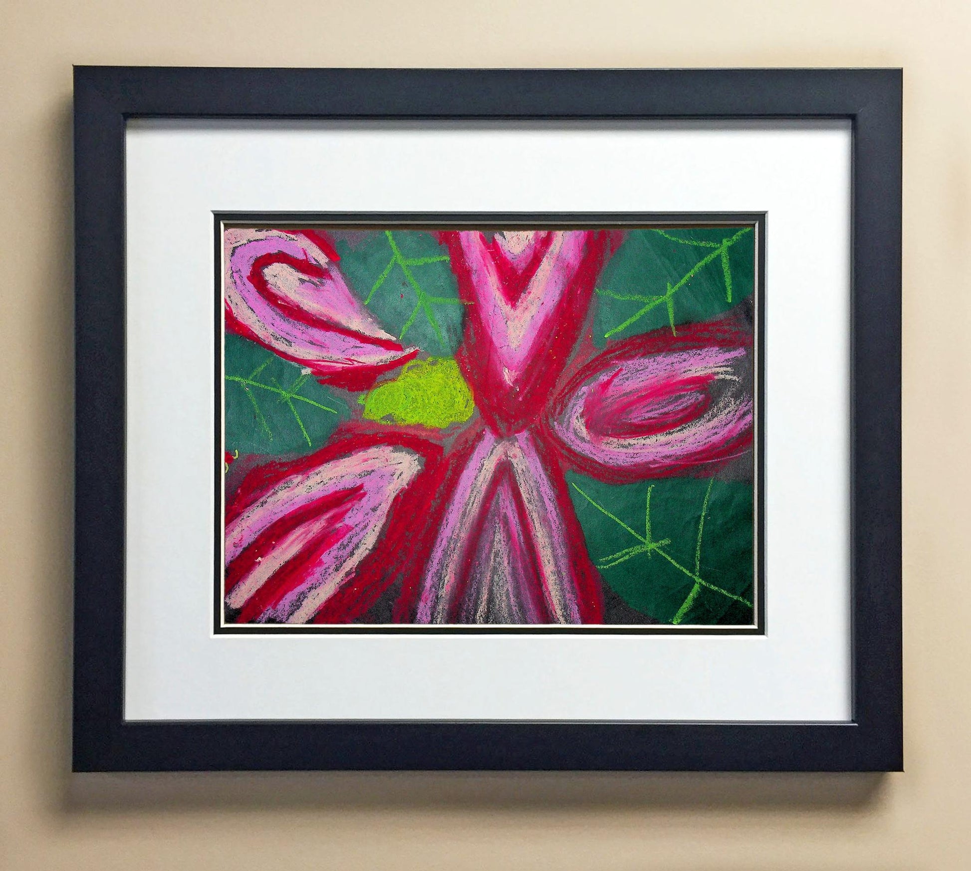 Included with the purchase is the Students Artwork, Frame, double matboard, shatter proof plexiglass, and a ready to hang backerboard with turnbuttons