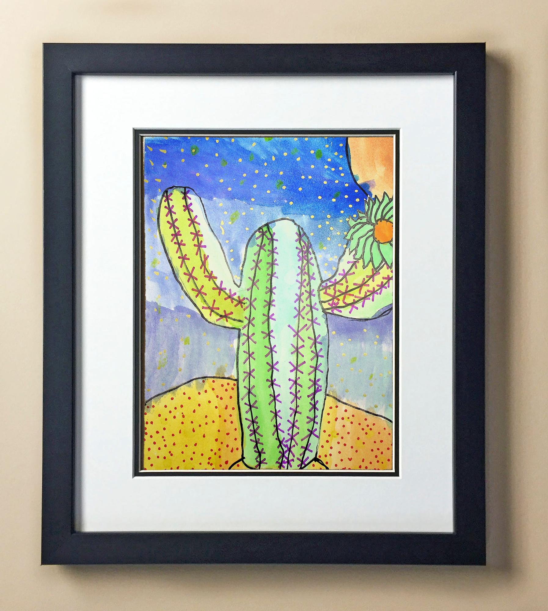 Included with the purchase is the Students Artwork, Frame, double matboard, shatter proof plexiglass, and a ready to hang backerboard with turnbuttons